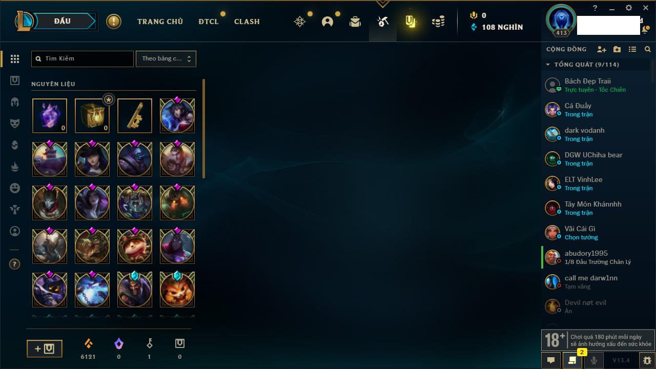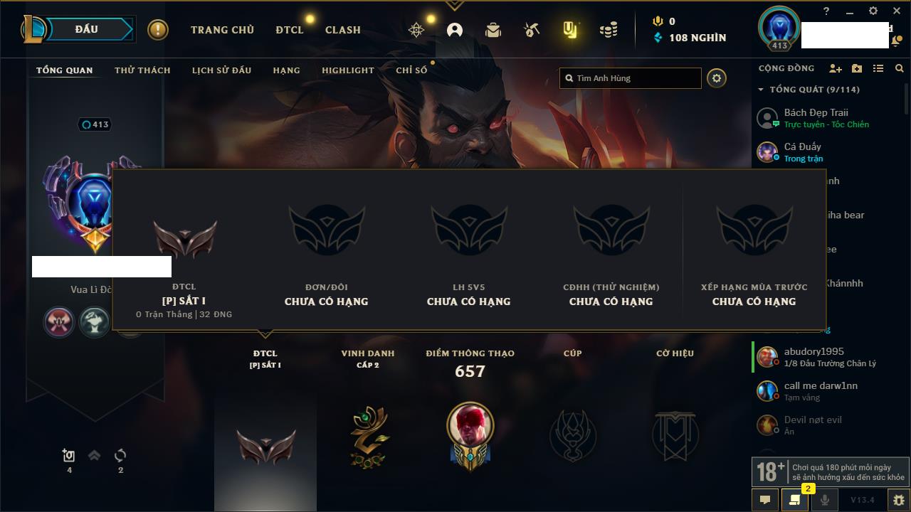 Rank Đơn: Chưa rank mùa nàoKhung: Chưa có khungTướng: 1 - Còn 3000 THXTrang Phục: 0Rank ĐTCL: Vàng ILinh Thú: 6