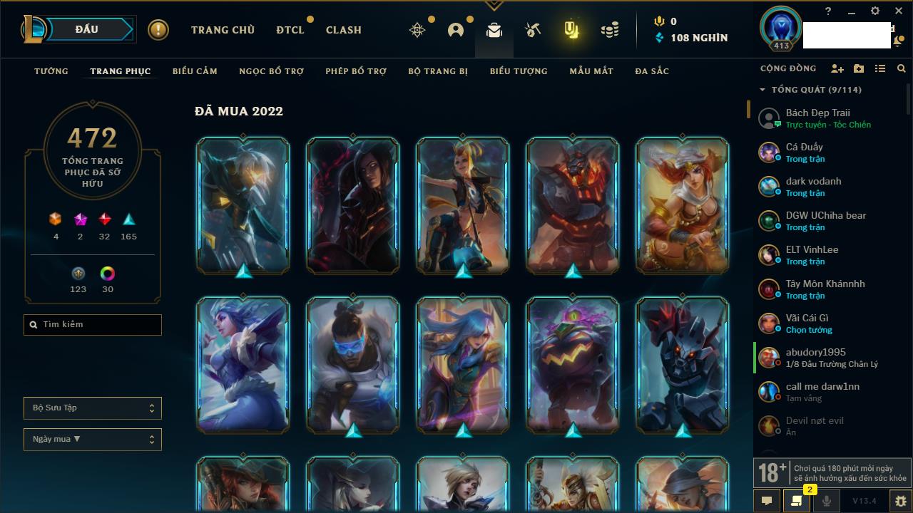 Rank Đơn: Chưa RankKhung: Chưa có khungTướng: 170 - Còn 72514 THXTrang Phục: 202Rank ĐTCL: Chưa RankLinh Thú: 191