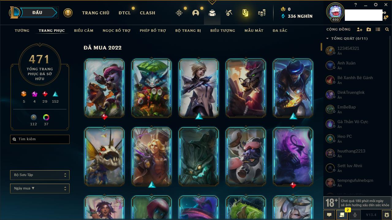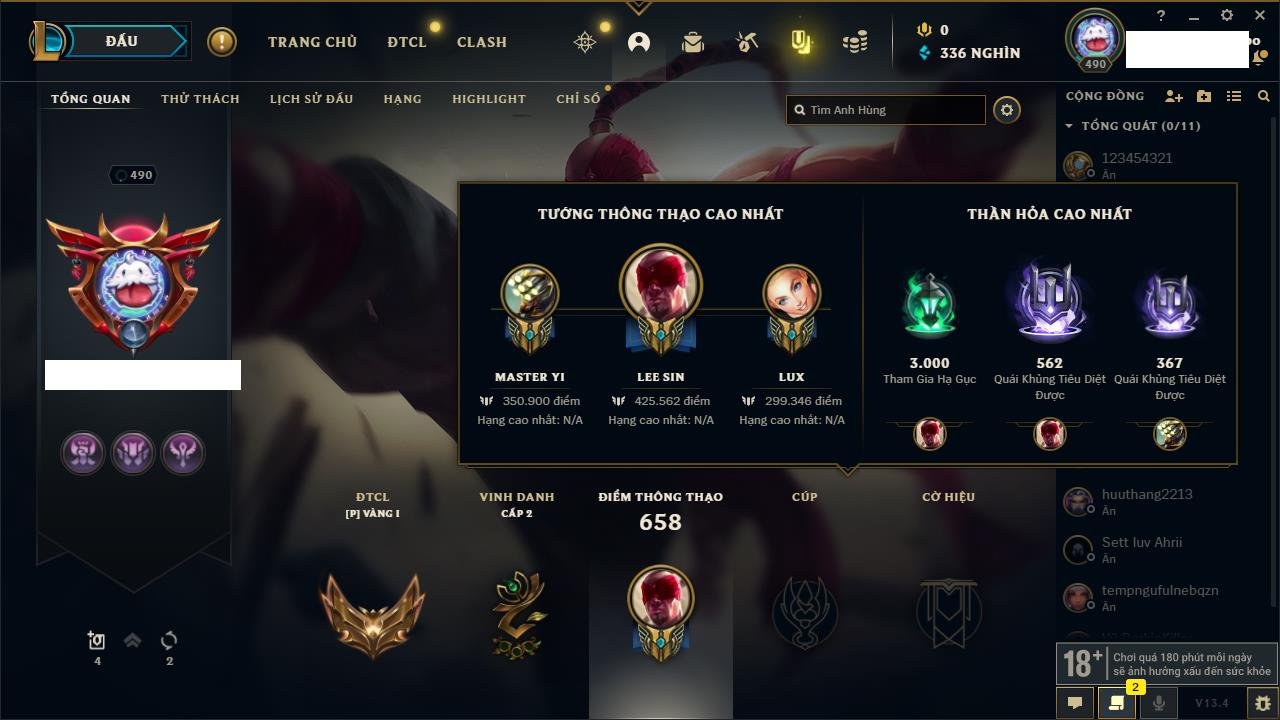 Rank Đơn: Vàng III Khung: Vàng Tướng: 171 - Còn 91047 THX Trang Phục: 98 Rank ĐTCL: Bạch Kim IV Linh Thú: 281