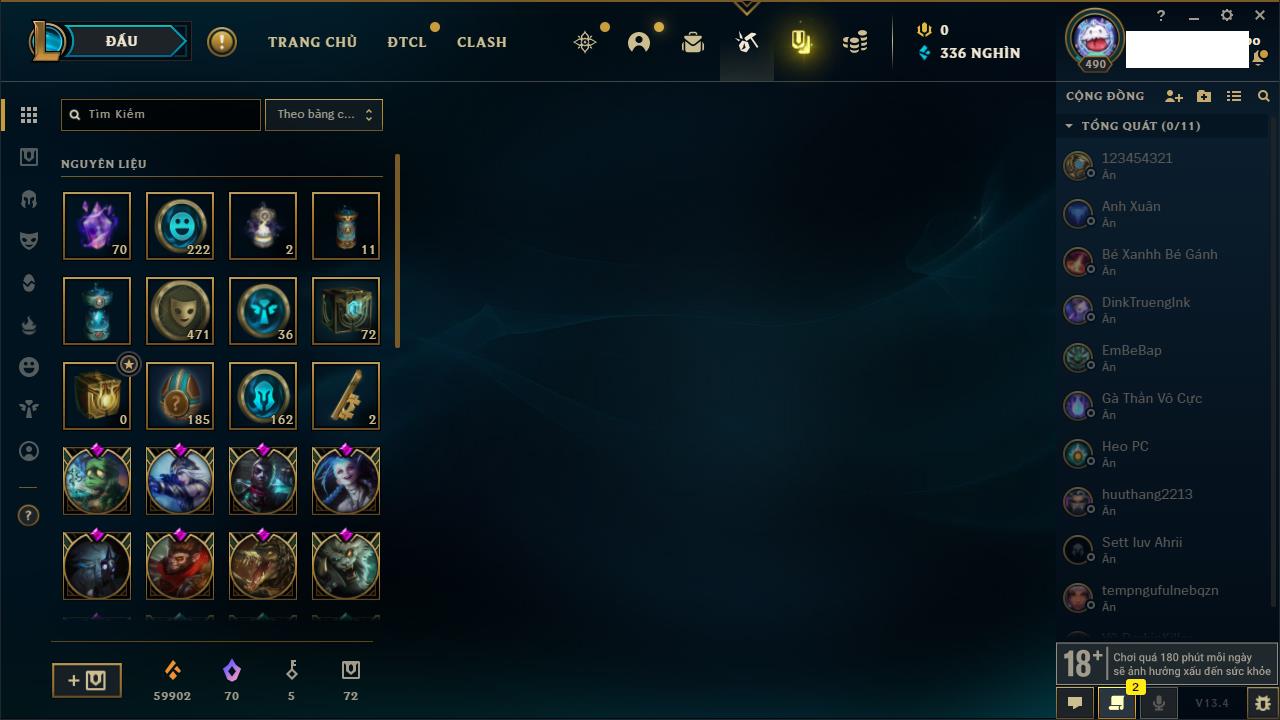 Rank Đơn: Chưa rank mùa nào Khung: Chưa có khung Tướng: 3 - Còn 3800 THX Trang Phục: 0 Rank ĐTCL: Chưa Rank Linh Thú: 31