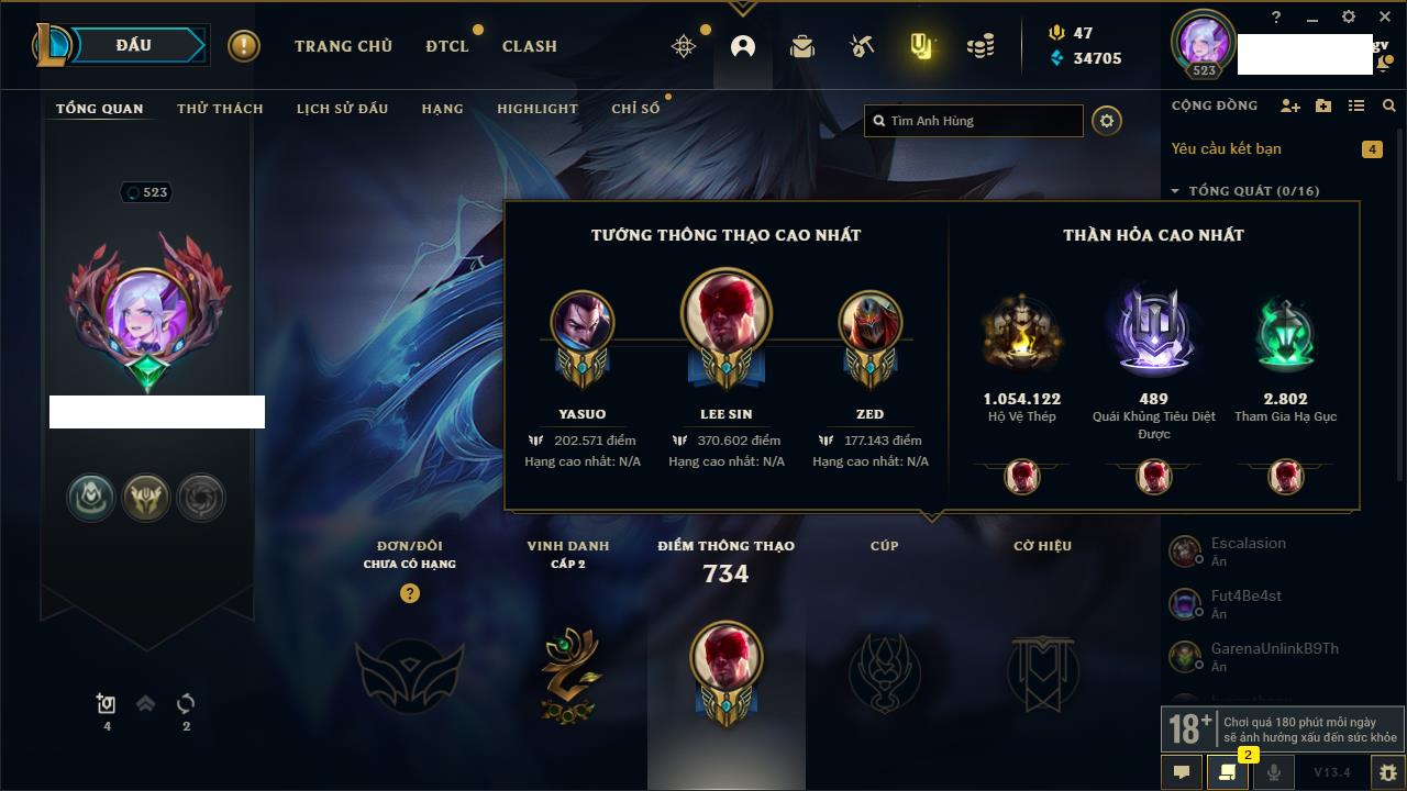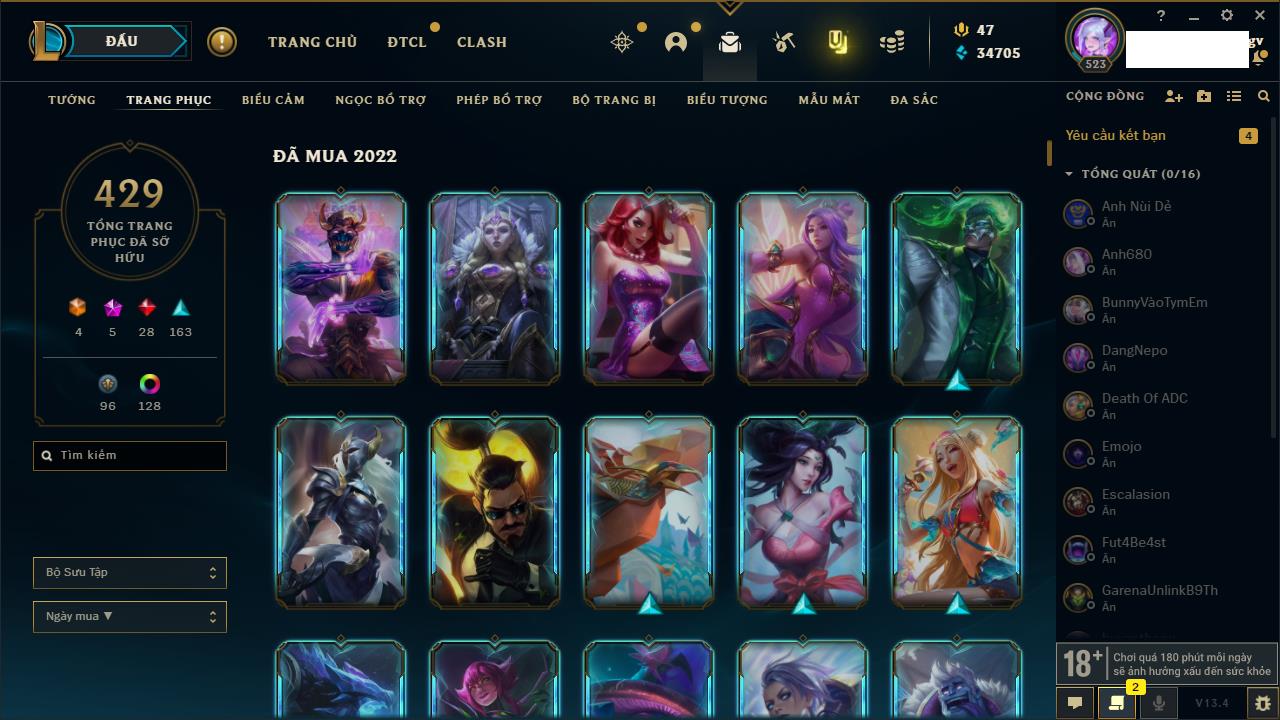 Rank Đơn: Vàng IKhung: Bạch kimTướng: 170 - Còn 212450 THXTrang Phục: 214Rank ĐTCL: Bạch Kim IVLinh Thú: 221