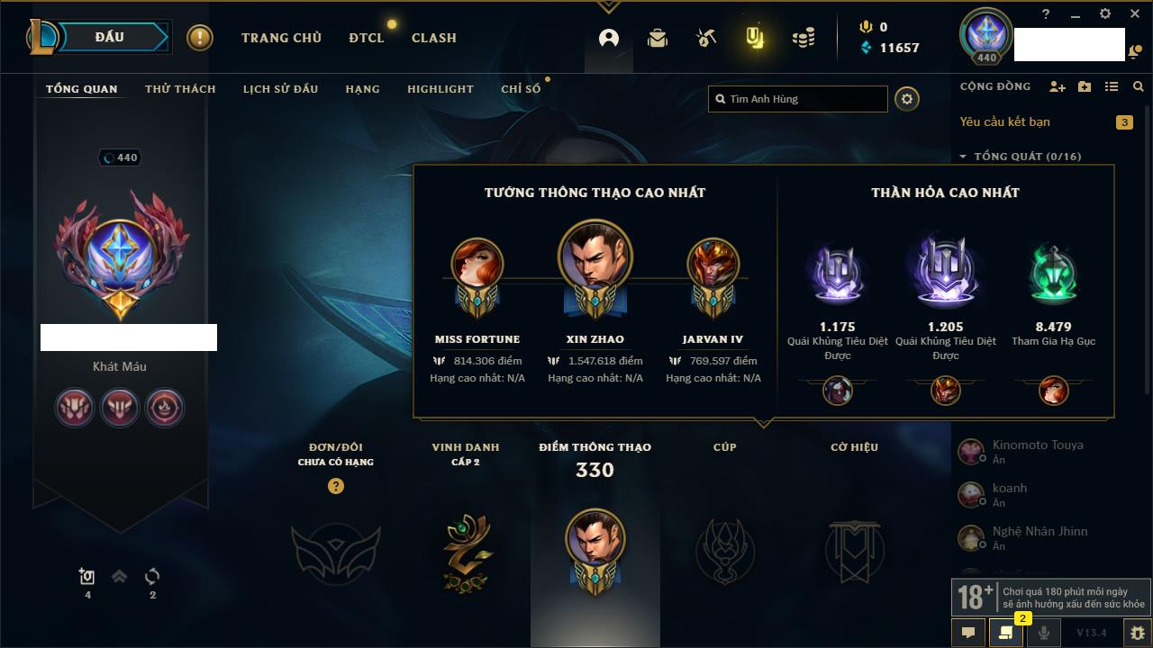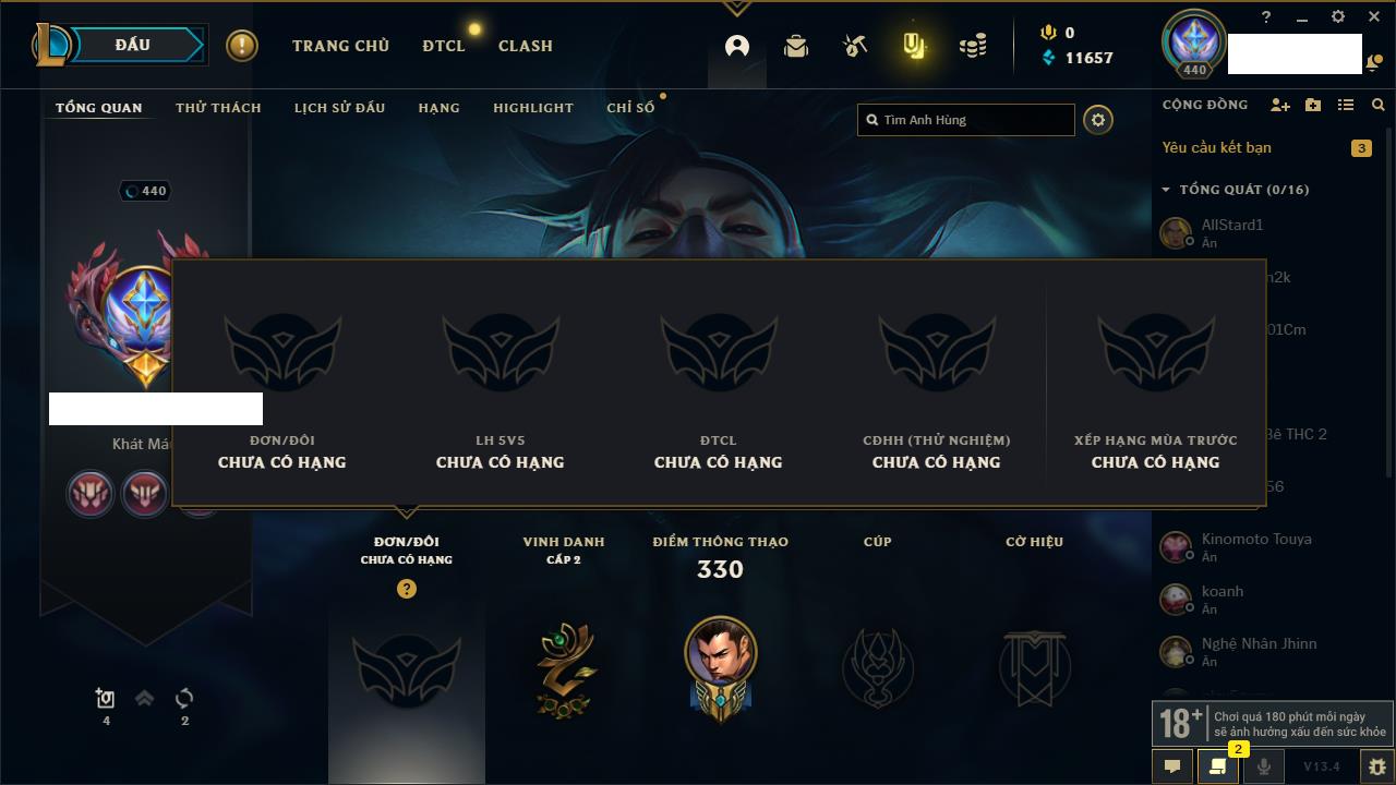 Rank Đơn: Bạch Kim IIIKhung: Bạch kimTướng: 171 - Còn 251383 THXTrang Phục: 229Rank ĐTCL: Sắt IILinh Thú: 51