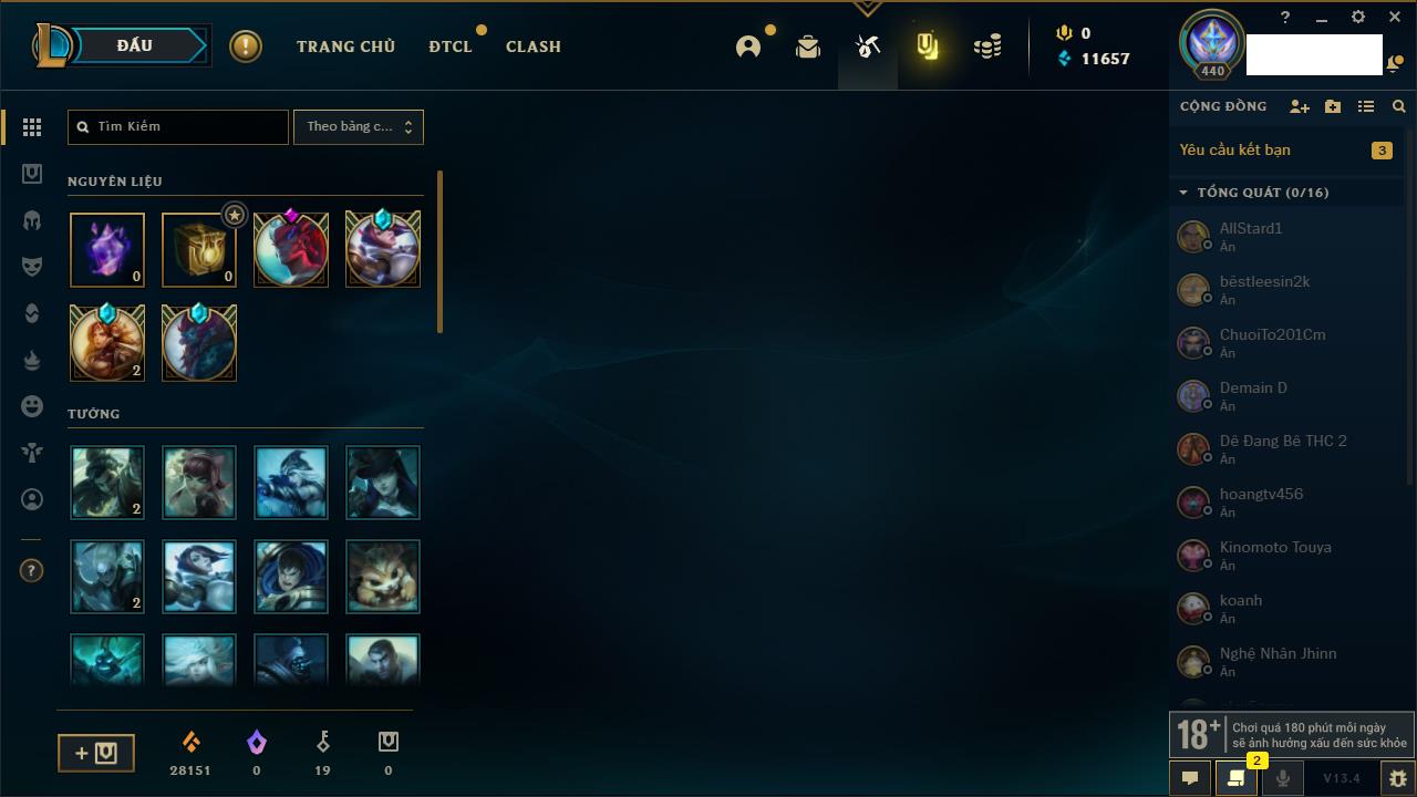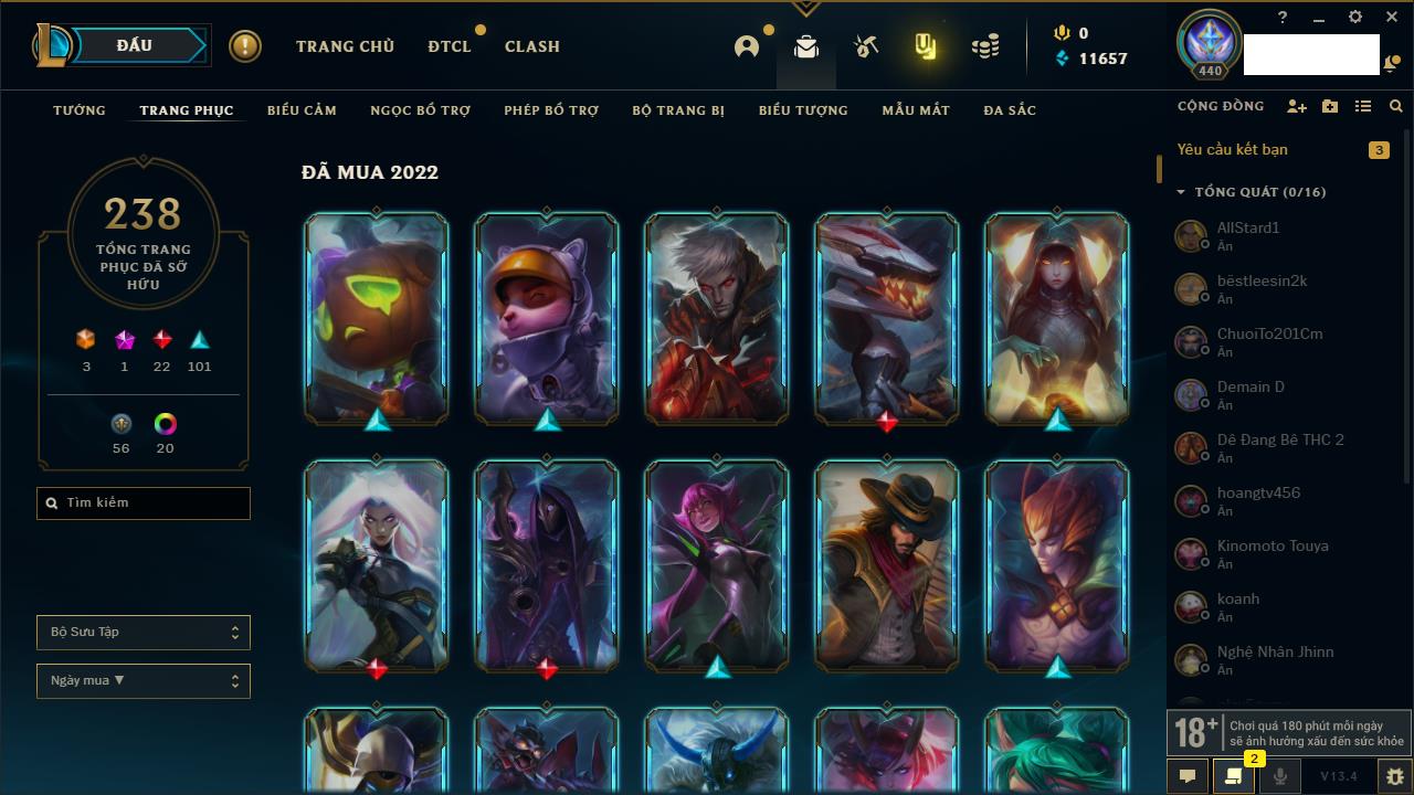 Rank Đơn: Vàng IIIKhung: VàngTướng: 171 - Còn 88128 THXTrang Phục: 329Rank ĐTCL: Chưa RankLinh Thú: 41