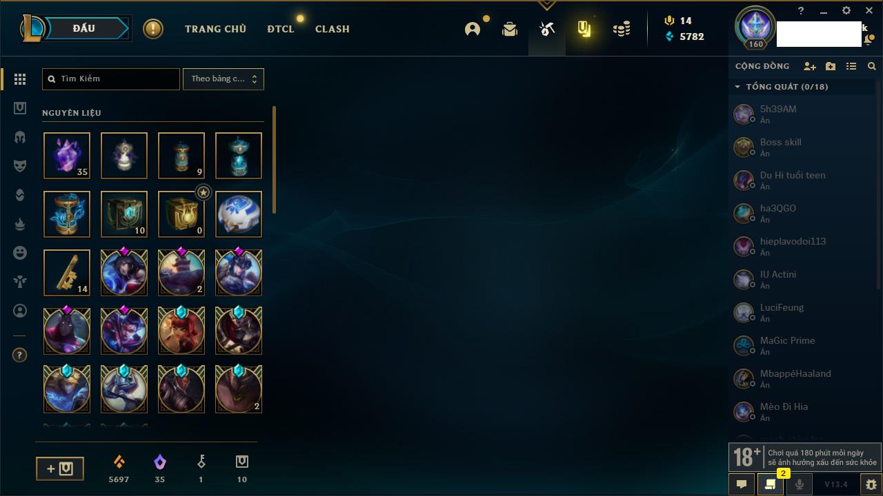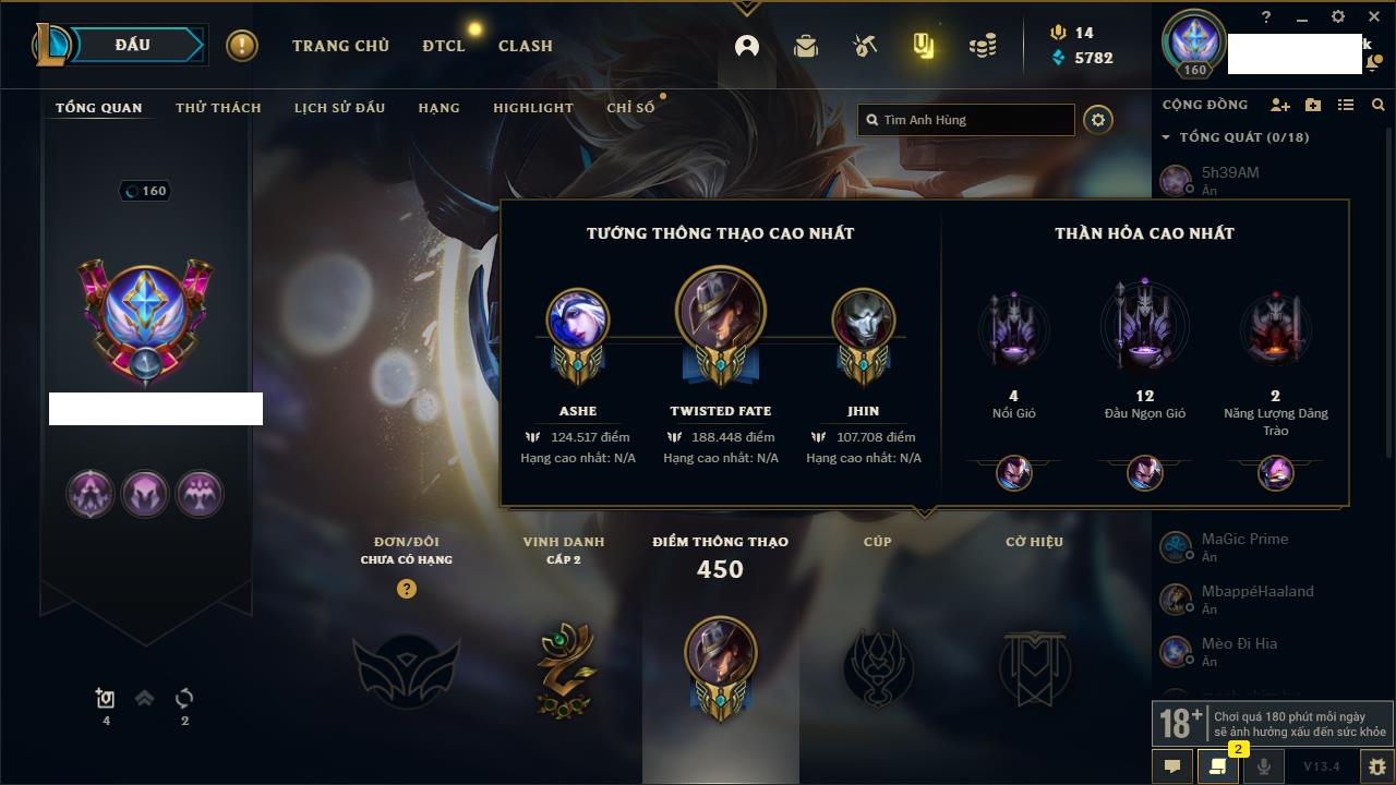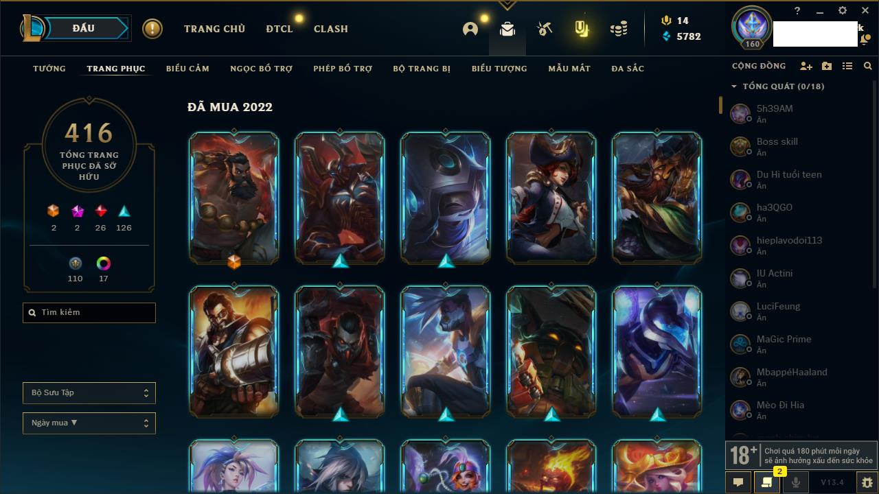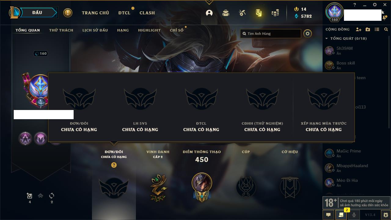 Rank Đơn: Bạc IIKhung: Bạch kimTướng: 169 - Còn 81813 THXTrang Phục: 301Rank ĐTCL: Chưa RankLinh Thú: 140
