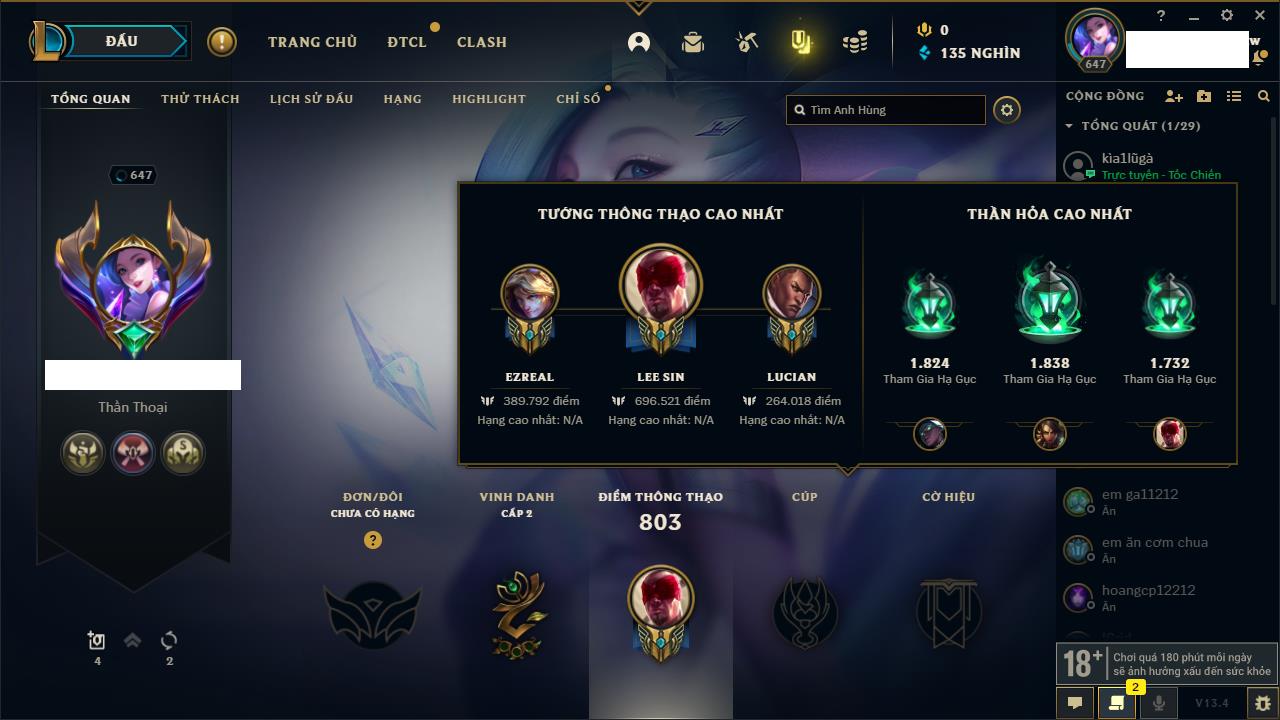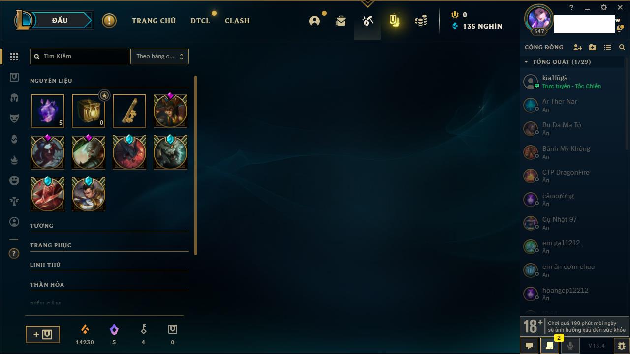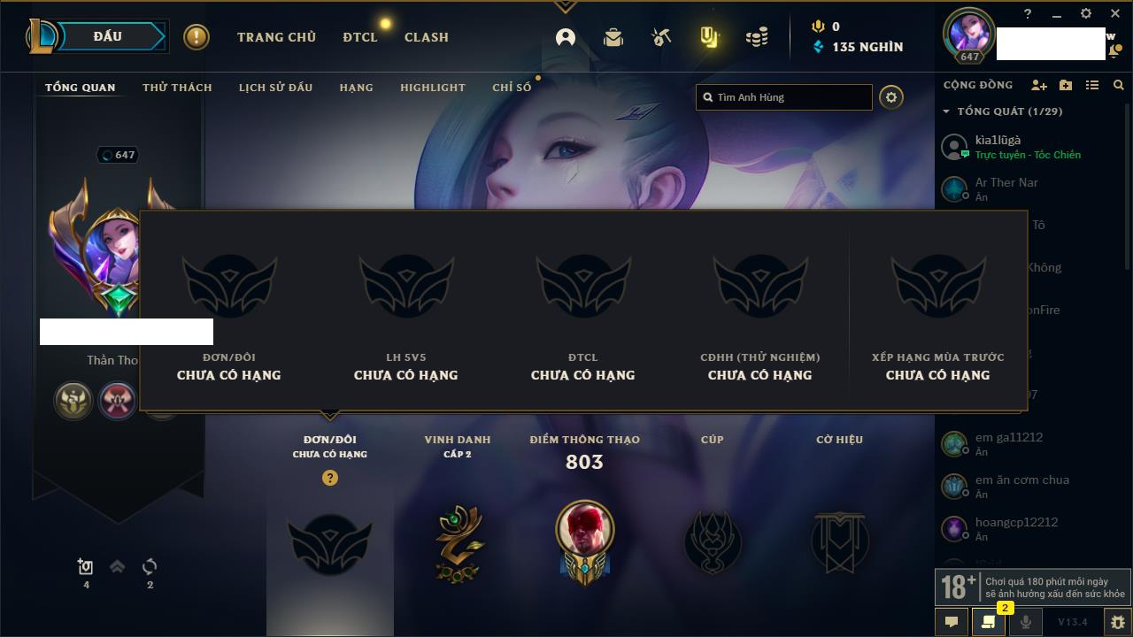 Rank Đơn: Bạch Kim IVKhung: Bạch kimTướng: 171 - Còn 182788 THXTrang Phục: 158Rank ĐTCL: Lục Bảo IVLinh Thú: 56
