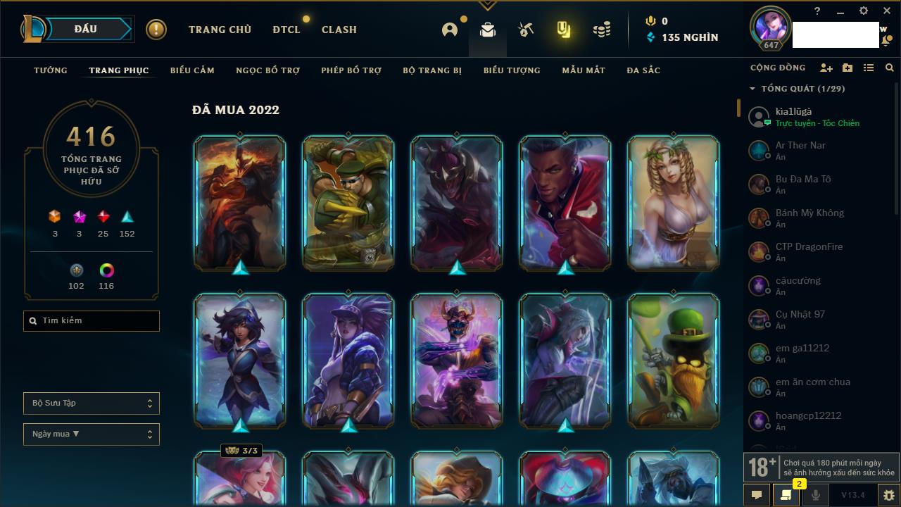 Rank Đơn: Đồng IIIKhung: ĐồngTướng: 170 - Còn 48082 THXTrang Phục: 272Rank ĐTCL: Chưa RankLinh Thú: 84