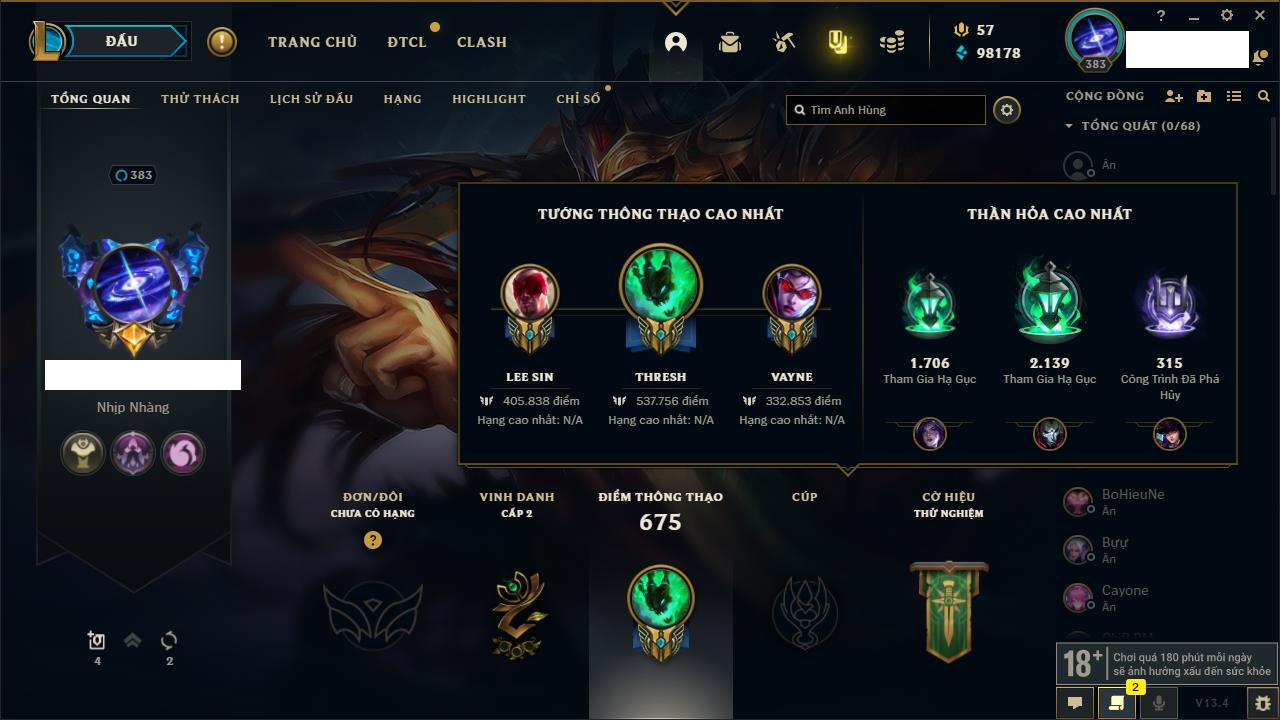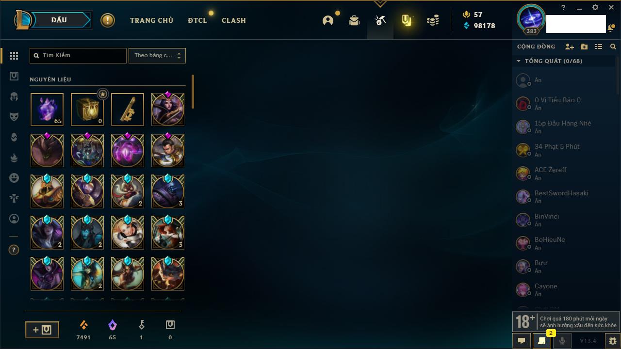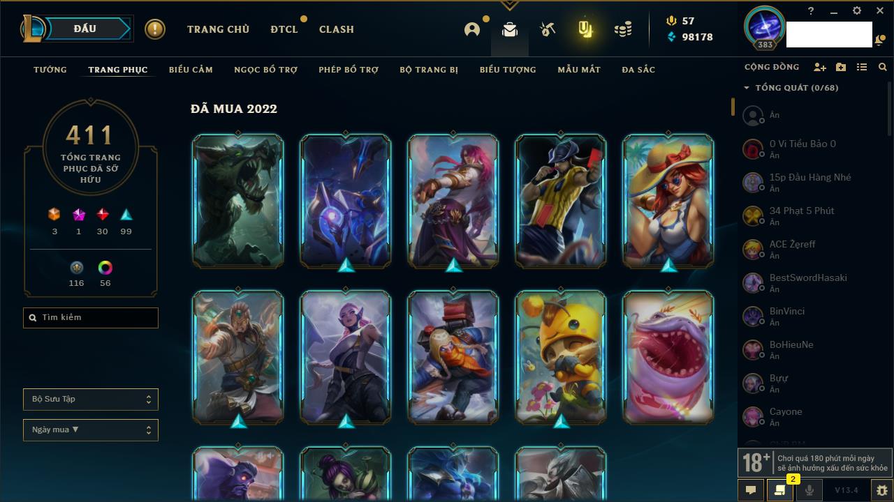 Rank Đơn: Vàng IKhung: Bạch kimTướng: 170 - Còn 212450 THXTrang Phục: 214Rank ĐTCL: Bạch Kim IVLinh Thú: 221