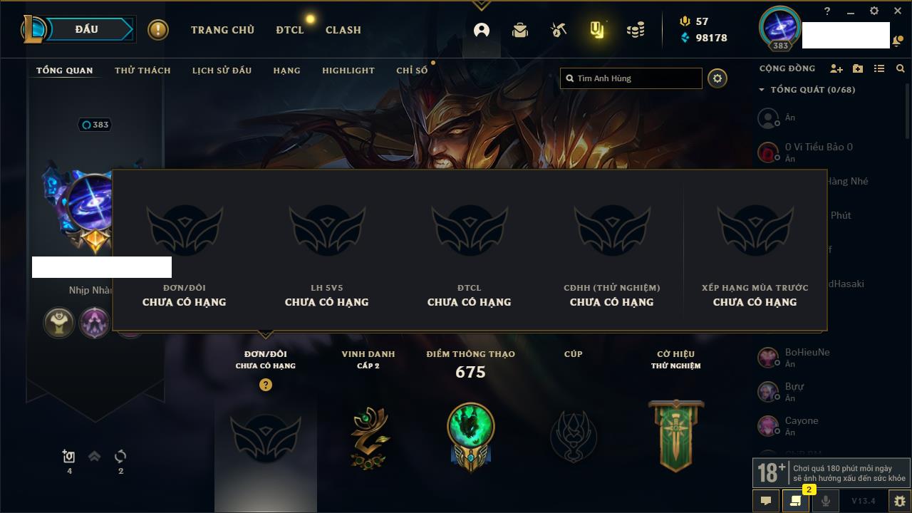 Rank Đơn: Bạch Kim IIKhung: Bạch kimTướng: 171 - Còn 263986 THXTrang Phục: 306Rank ĐTCL: Lục Bảo IVLinh Thú: 96