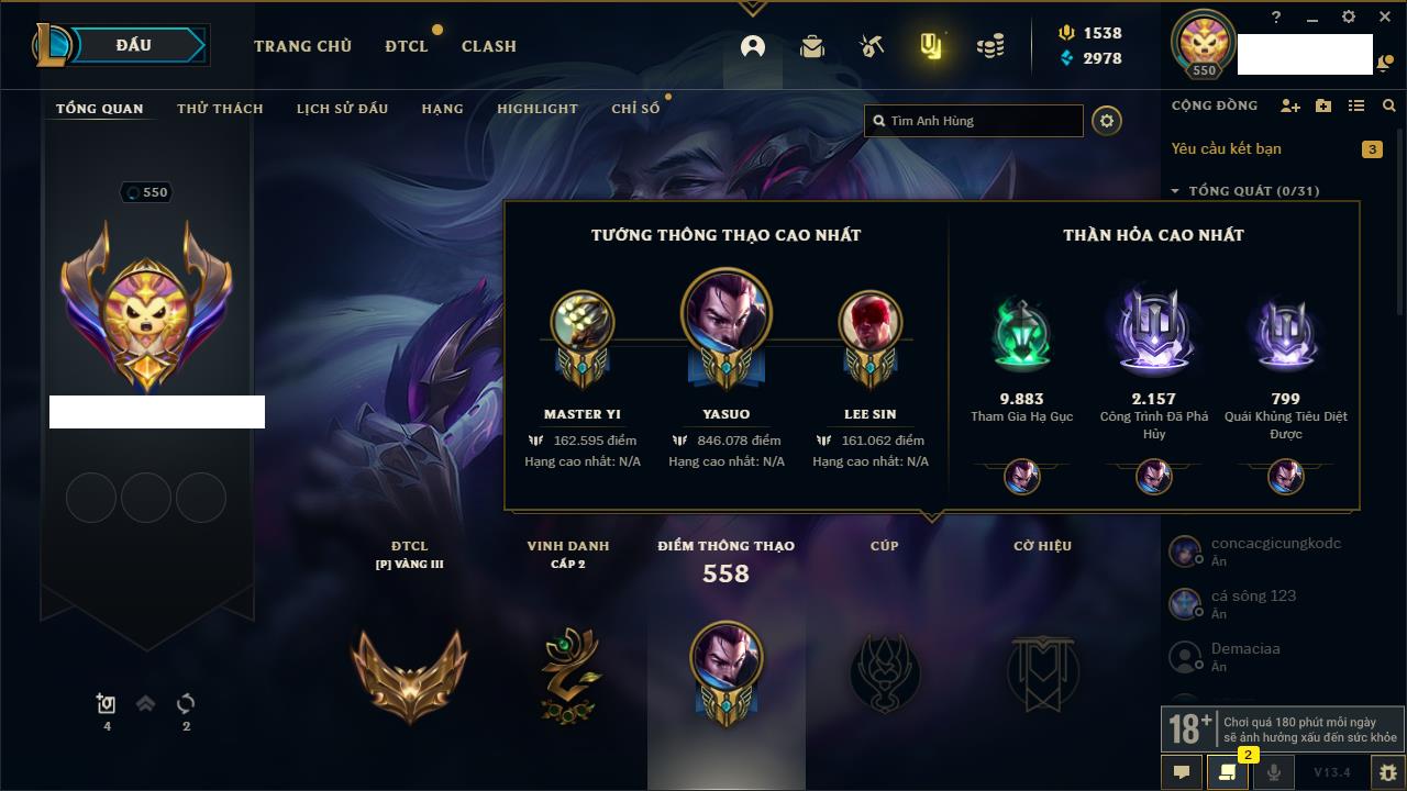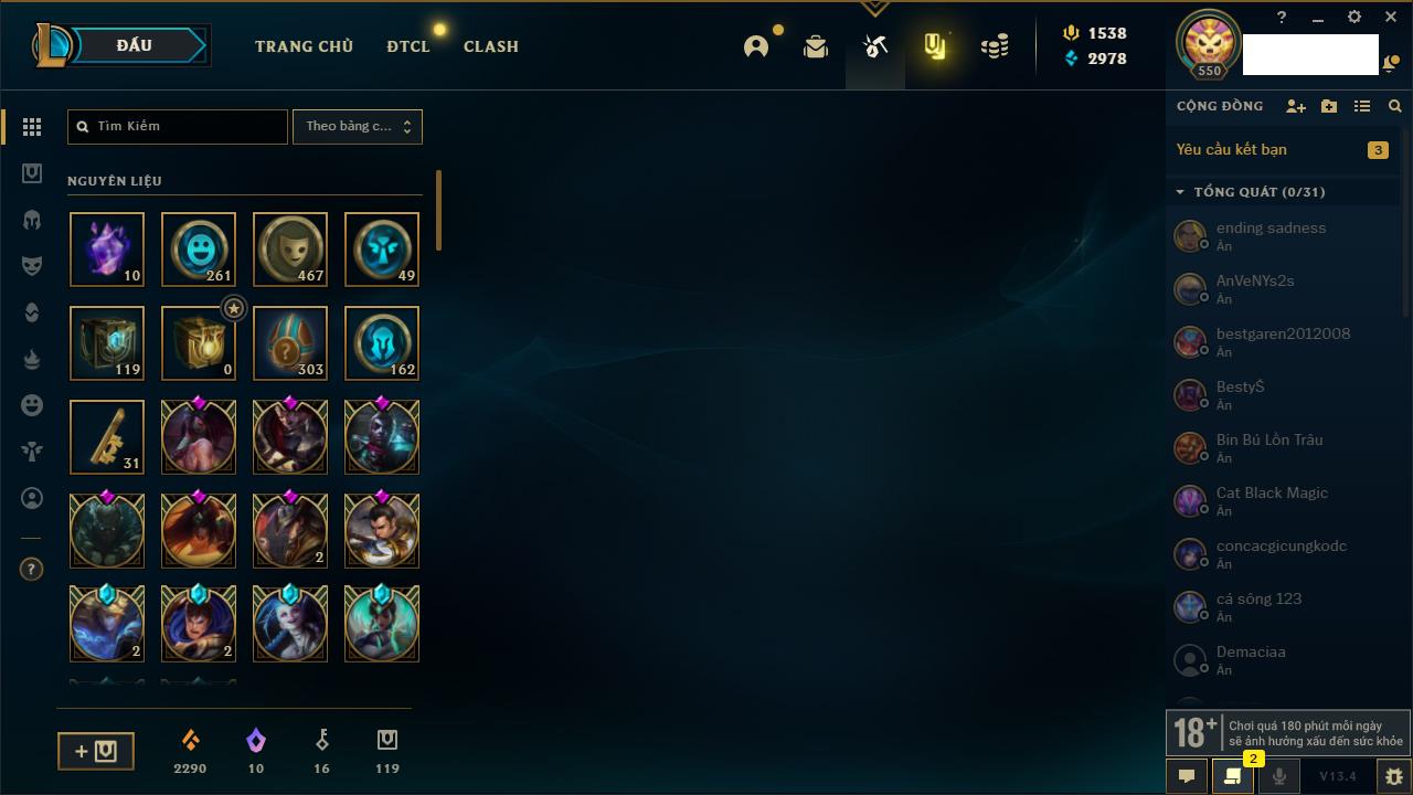Rank Đơn: Chưa rank mùa nào Khung: Chưa có khung Tướng: 9 - Còn 43550 THX Trang Phục: 0 Rank ĐTCL: Rank Cao Thủ Linh Thú: 91
