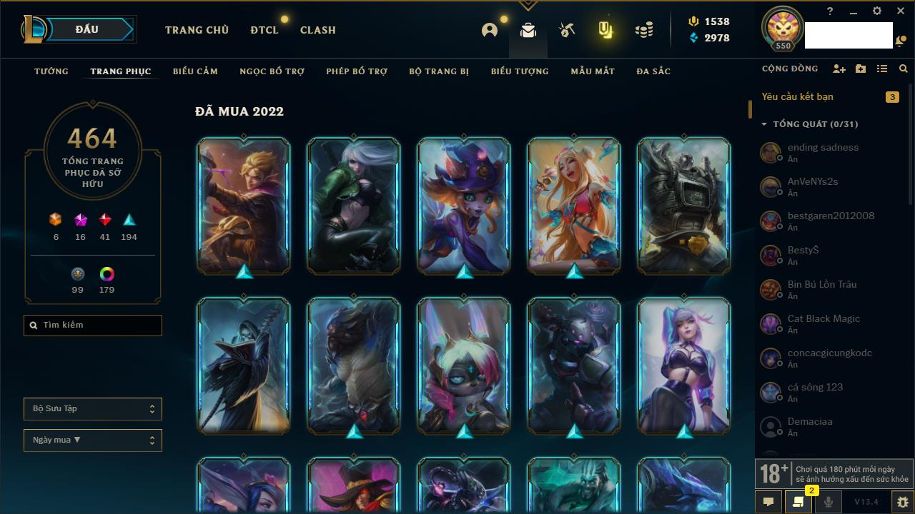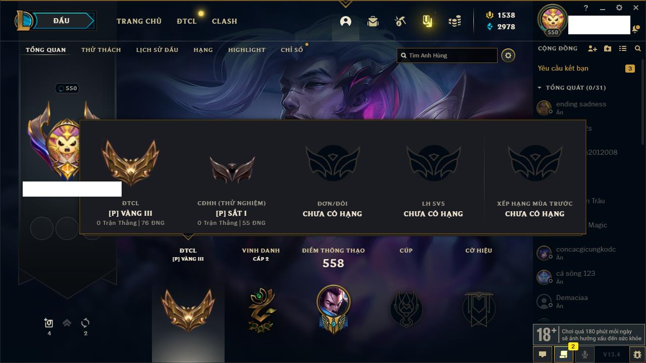 Rank Đơn: Chưa Rank Khung: Chưa có khung Tướng: 162 - Còn 2978 THX Trang Phục: 464 Rank ĐTCL: Chưa Rank Linh Thú: 211