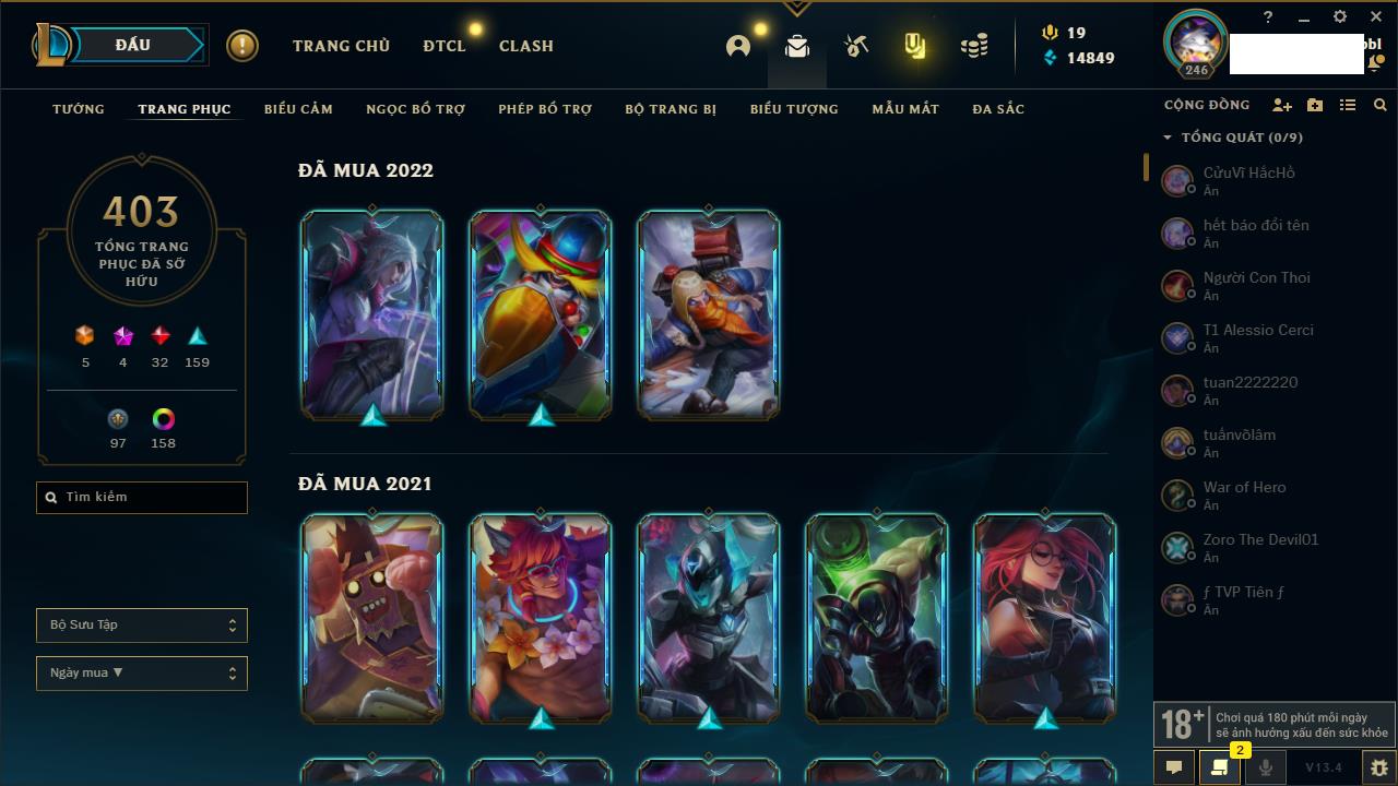 Rank Đơn: Chưa RankKhung: Chưa có khungTướng: 158 - Còn 14849 THXTrang Phục: 403Rank ĐTCL: Chưa RankLinh Thú: 18