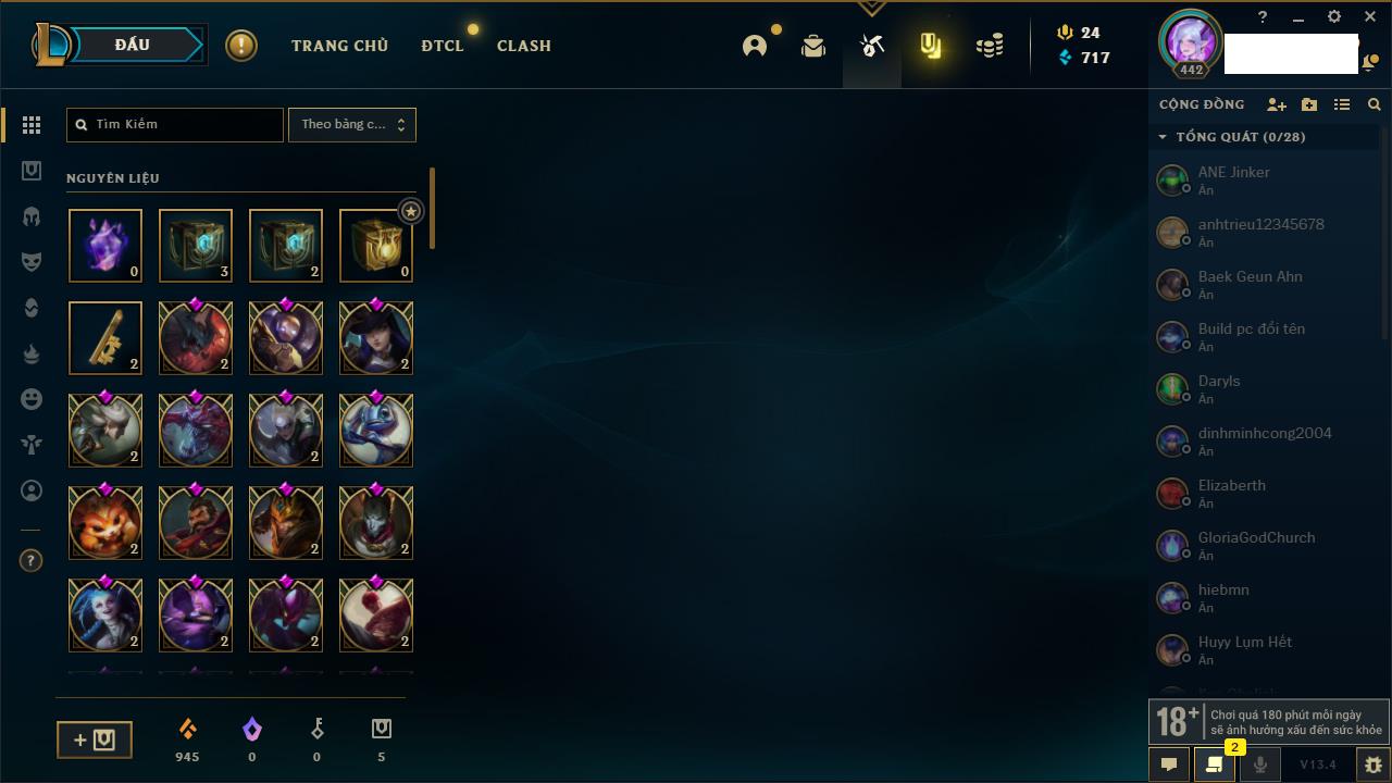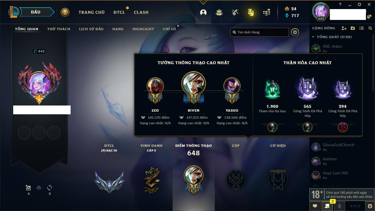 Rank Đơn: Bạch Kim IIIKhung: Bạch kimTướng: 170 - Còn 61079 THXTrang Phục: 352Rank ĐTCL: Sắt IILinh Thú: 70