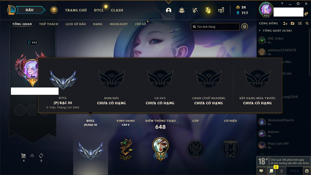 Rank Đơn: Đồng IIIKhung: ĐồngTướng: 170 - Còn 48082 THXTrang Phục: 272Rank ĐTCL: Chưa RankLinh Thú: 84