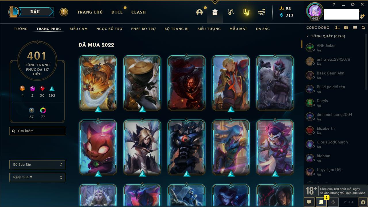 Rank Đơn: Vàng IKhung: Bạch kimTướng: 170 - Còn 212450 THXTrang Phục: 214Rank ĐTCL: Bạch Kim IVLinh Thú: 221