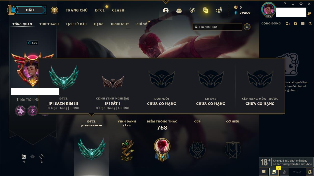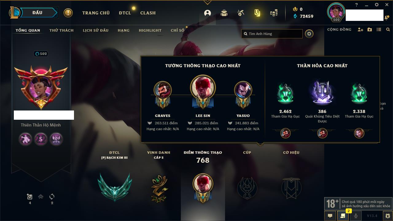 Rank Đơn: Bạch Kim IIKhung: Bạch kimTướng: 171 - Còn 263986 THXTrang Phục: 306Rank ĐTCL: Lục Bảo IVLinh Thú: 96
