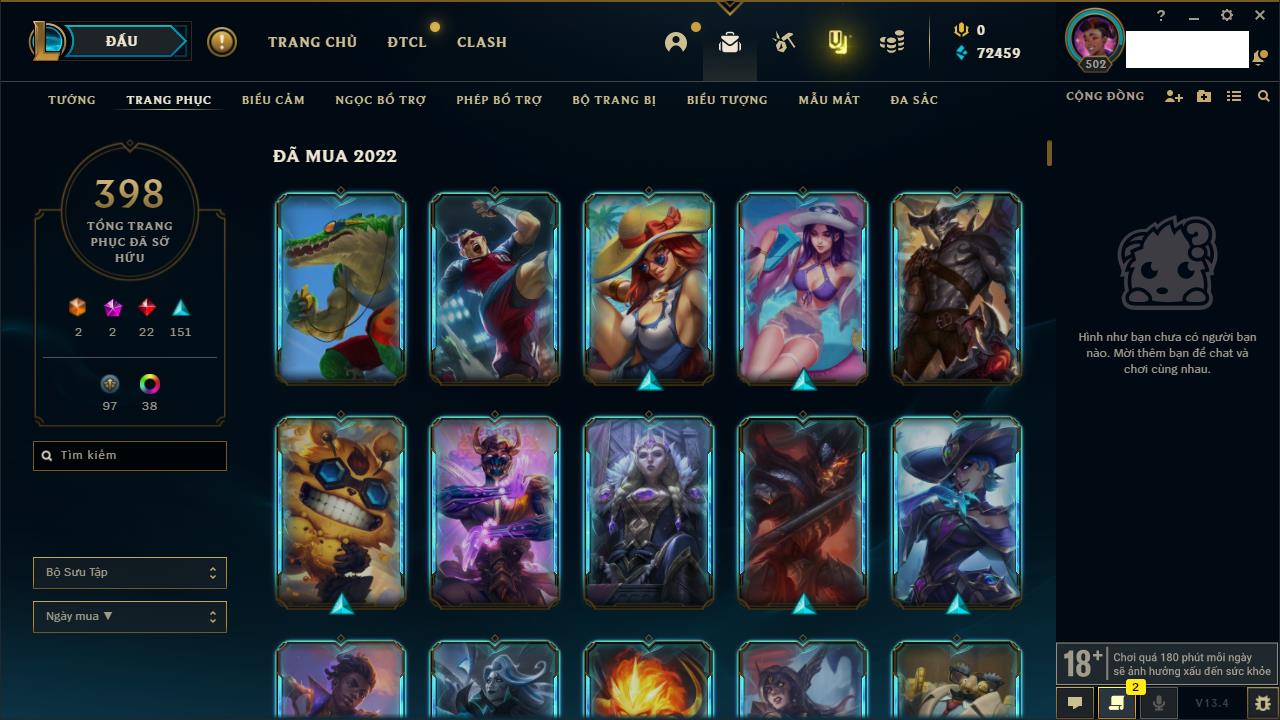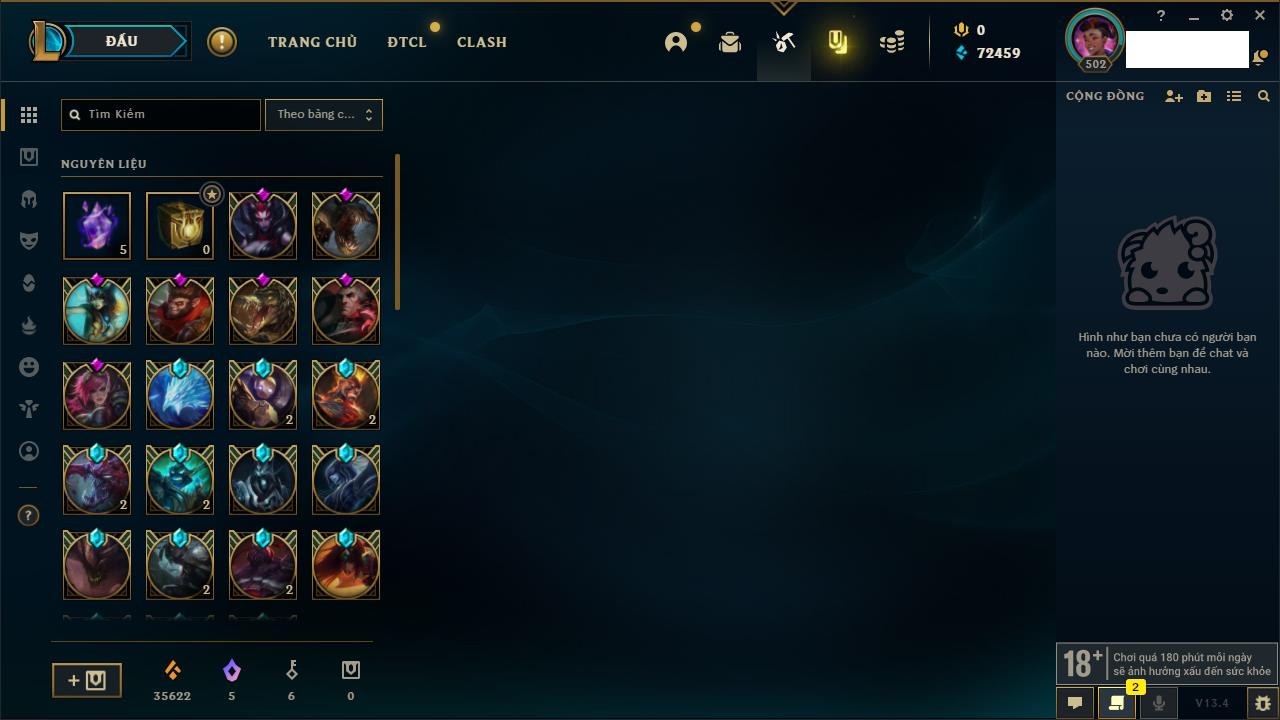 Rank Đơn: Vàng IKhung: Bạch kimTướng: 170 - Còn 212450 THXTrang Phục: 214Rank ĐTCL: Bạch Kim IVLinh Thú: 221
