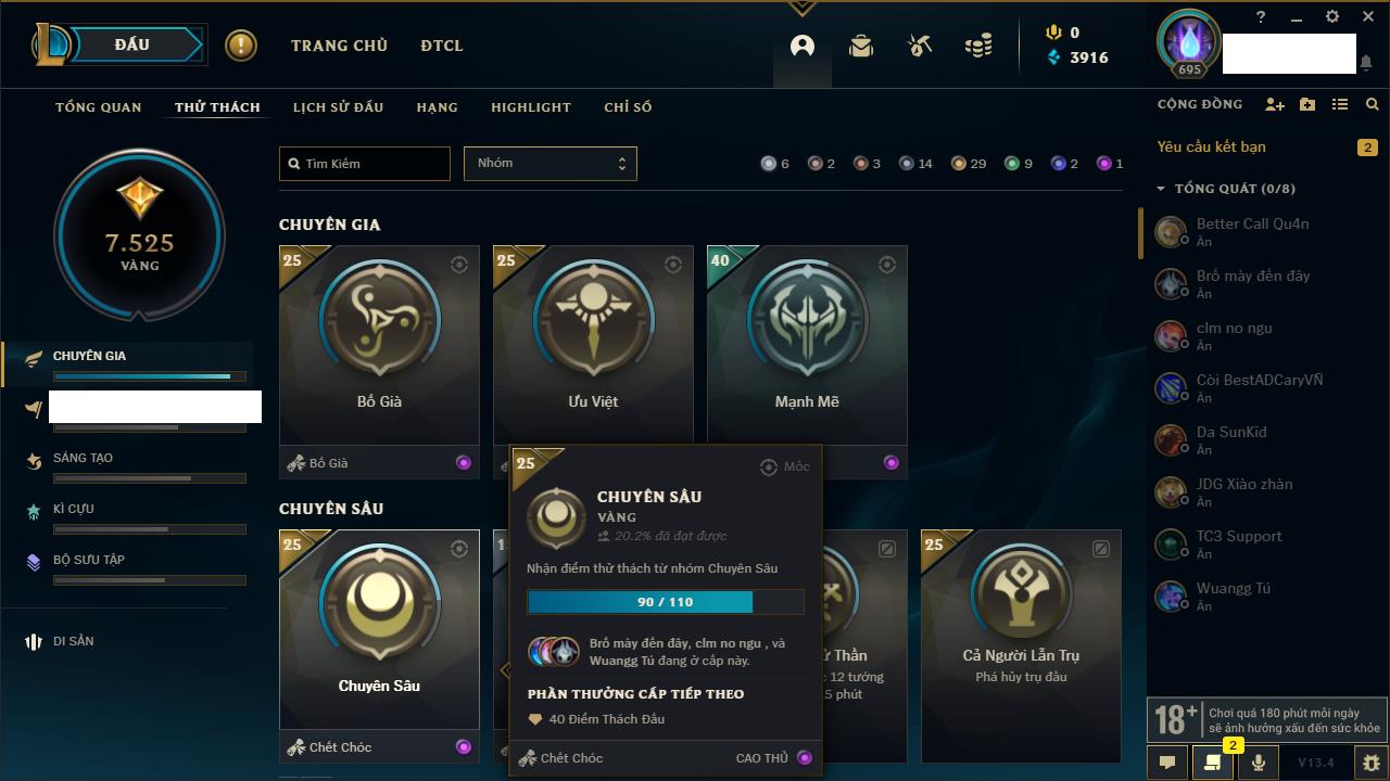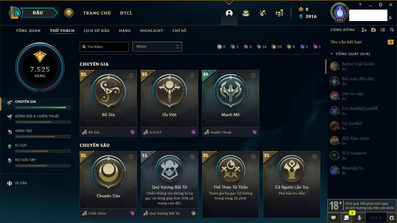 Rank Đơn: Vàng IKhung: Bạch kimTướng: 170 - Còn 212450 THXTrang Phục: 214Rank ĐTCL: Bạch Kim IVLinh Thú: 221