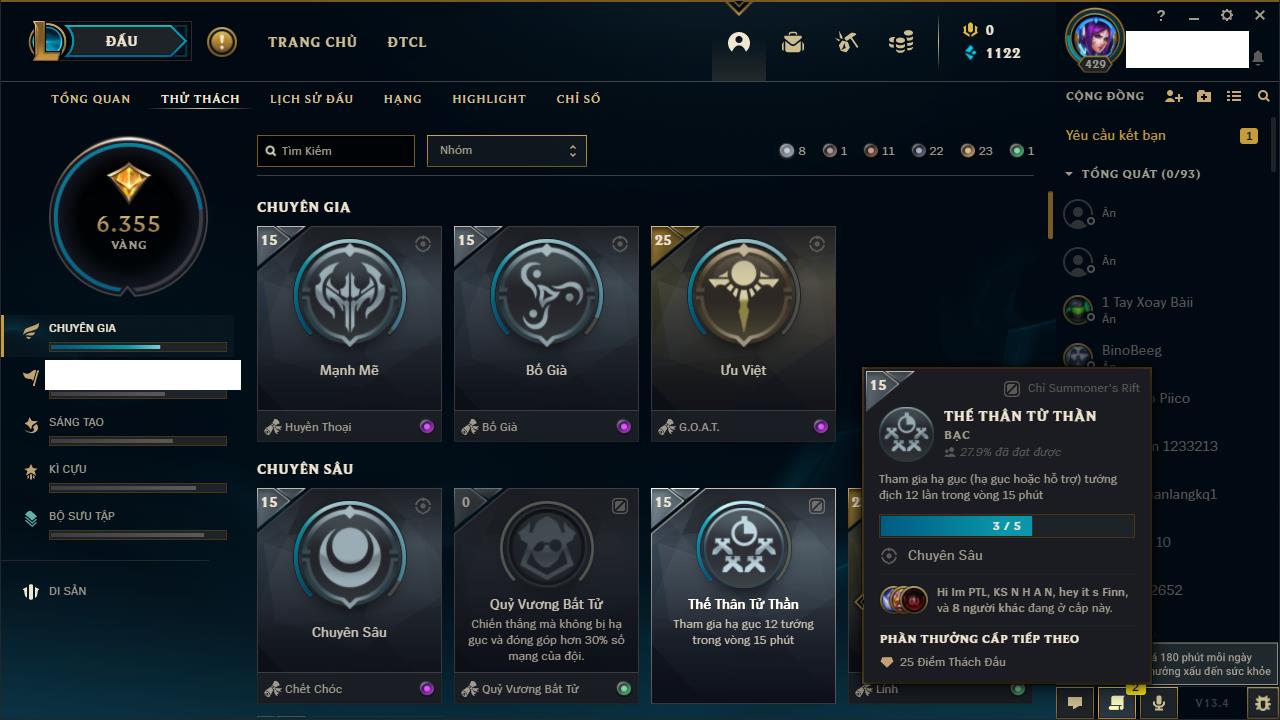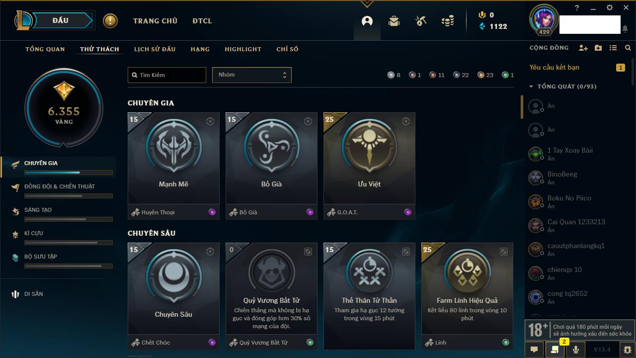 Rank Đơn: Vàng IKhung: Bạch kimTướng: 170 - Còn 212450 THXTrang Phục: 214Rank ĐTCL: Bạch Kim IVLinh Thú: 221