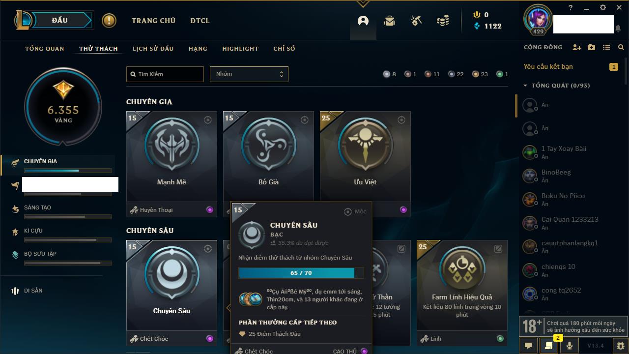Rank Đơn: Bạch Kim IVKhung: Bạch kimTướng: 171 - Còn 182788 THXTrang Phục: 158Rank ĐTCL: Lục Bảo IVLinh Thú: 56