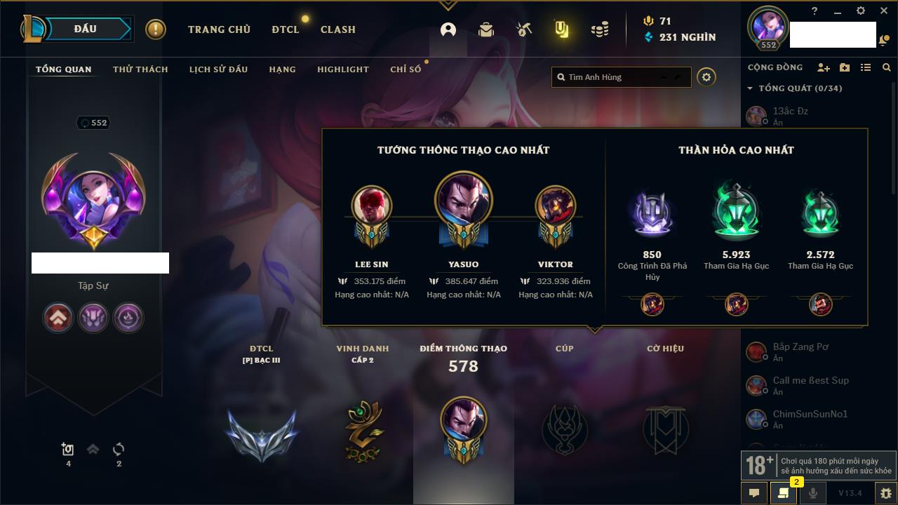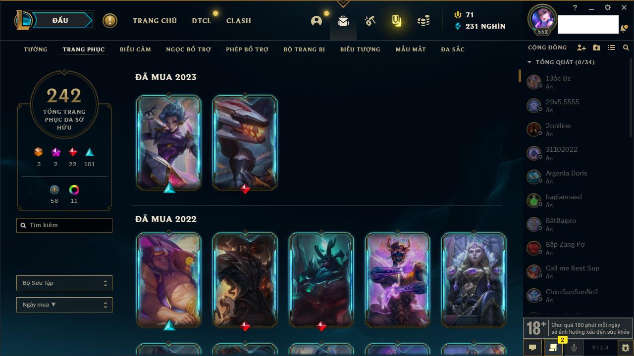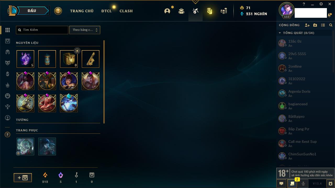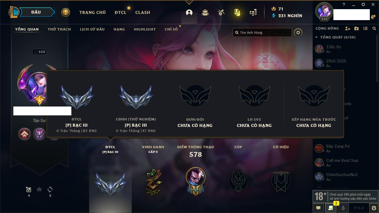 Rank Đơn: Vàng IIIKhung: BạcTướng: 171 - Còn 101359 THXTrang Phục: 88Rank ĐTCL: Kim Cương IVLinh Thú: 200