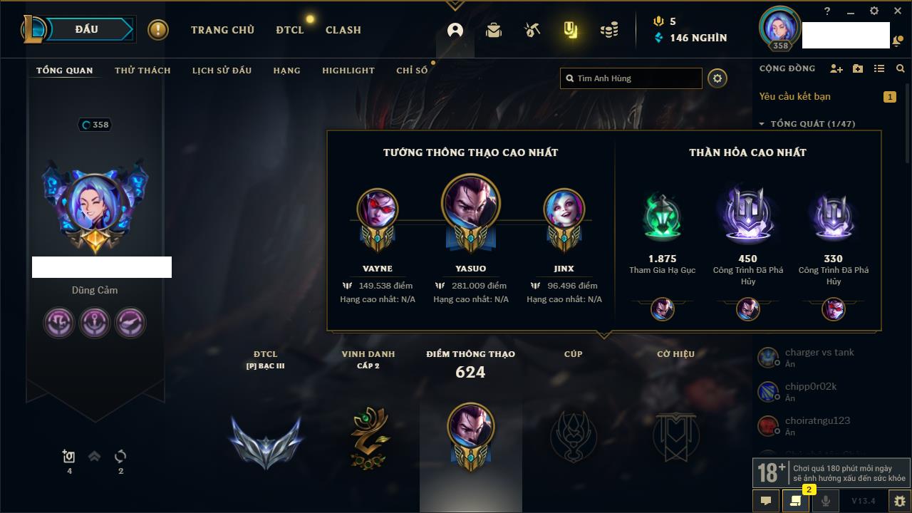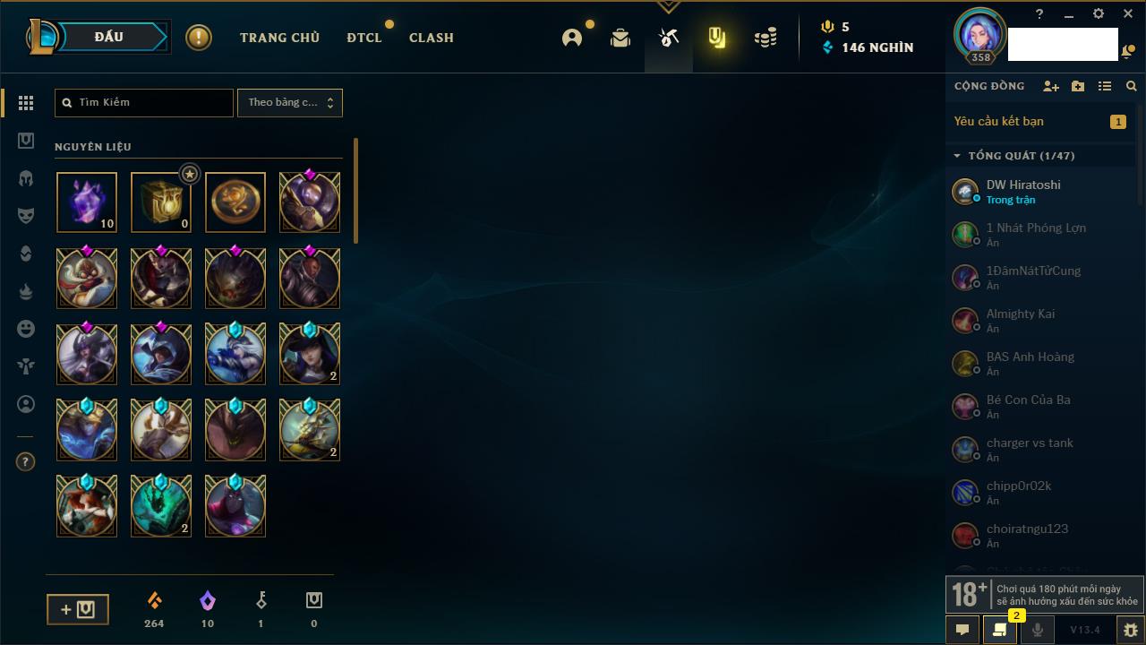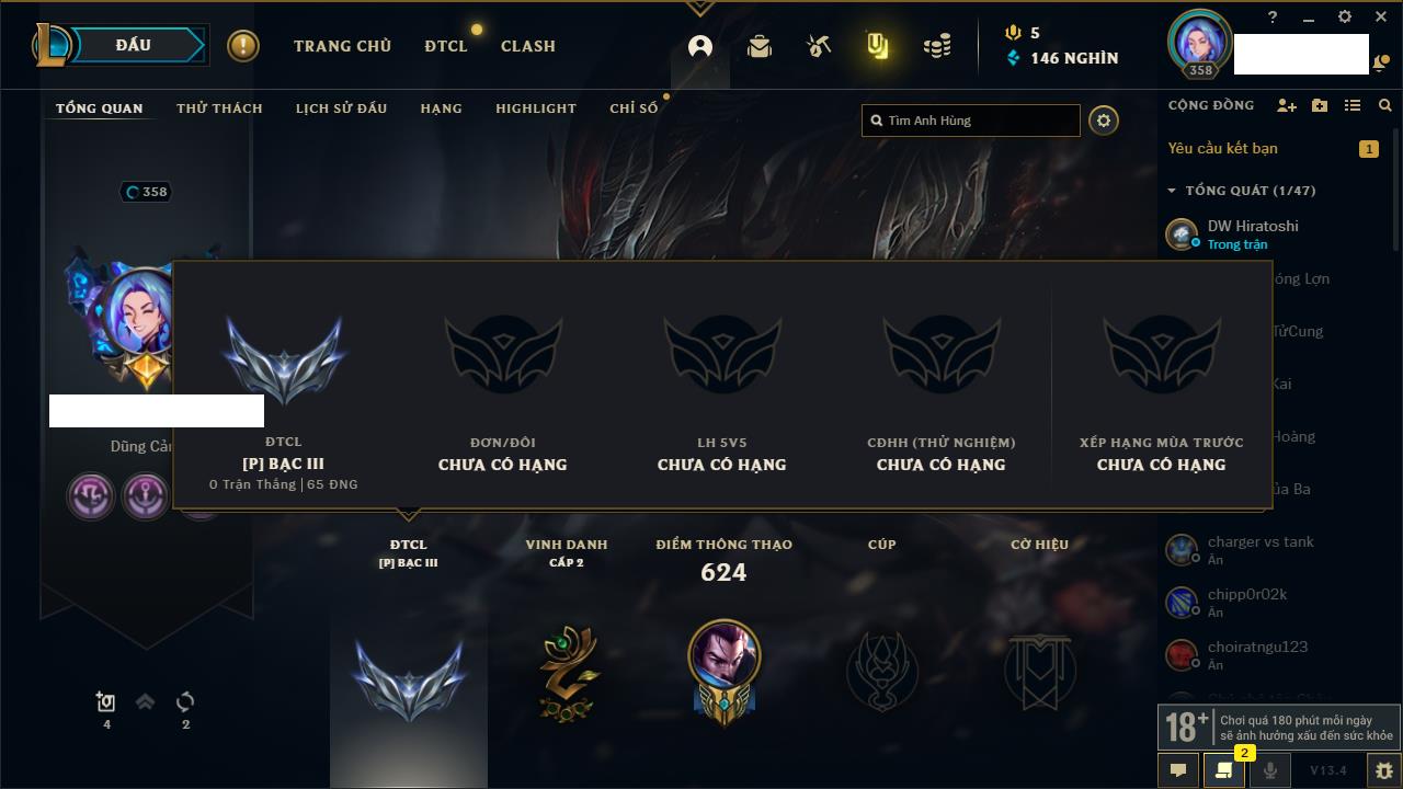 Rank Đơn: Bạch Kim IIKhung: Bạch kimTướng: 171 - Còn 263986 THXTrang Phục: 306Rank ĐTCL: Lục Bảo IVLinh Thú: 96