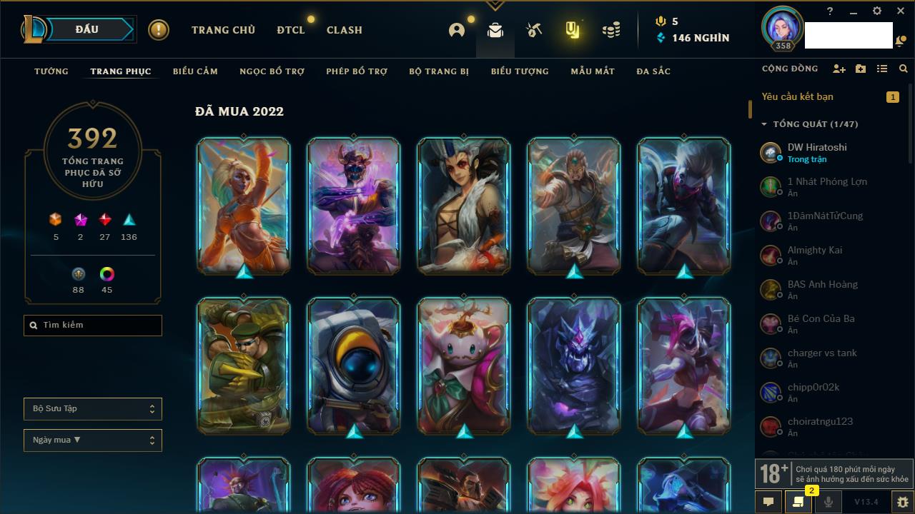 Rank Đơn: Vàng IKhung: Bạch kimTướng: 170 - Còn 212450 THXTrang Phục: 214Rank ĐTCL: Bạch Kim IVLinh Thú: 221