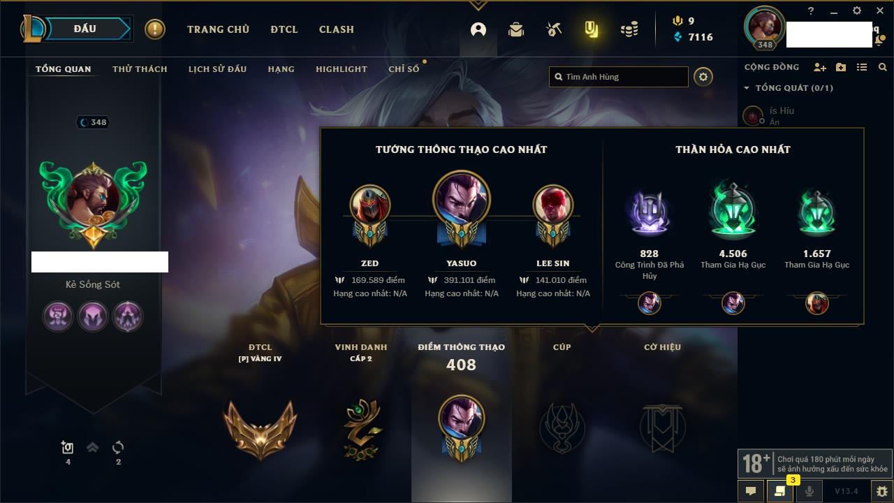 Rank Đơn: Bạch Kim IIIKhung: Bạch kimTướng: 170 - Còn 61079 THXTrang Phục: 352Rank ĐTCL: Sắt IILinh Thú: 70