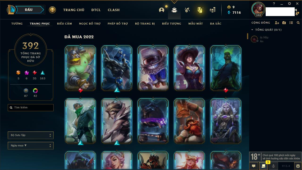 Rank Đơn: Đồng IIIKhung: ĐồngTướng: 170 - Còn 48082 THXTrang Phục: 272Rank ĐTCL: Chưa RankLinh Thú: 84