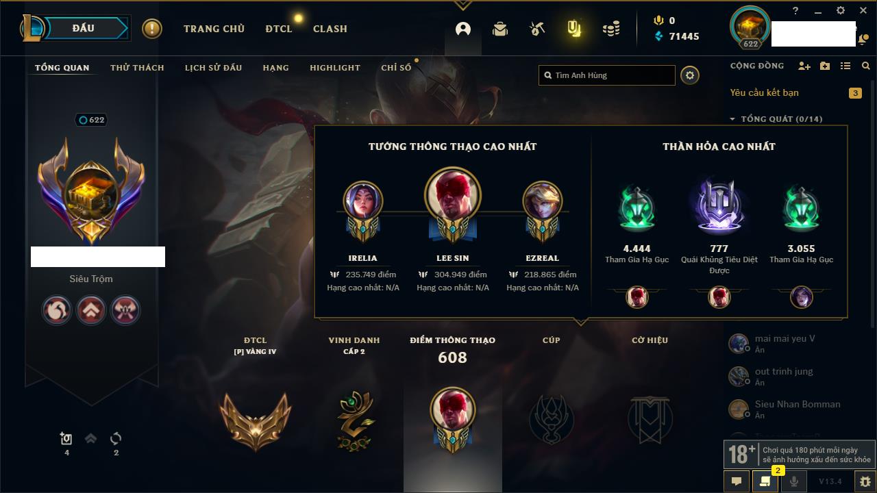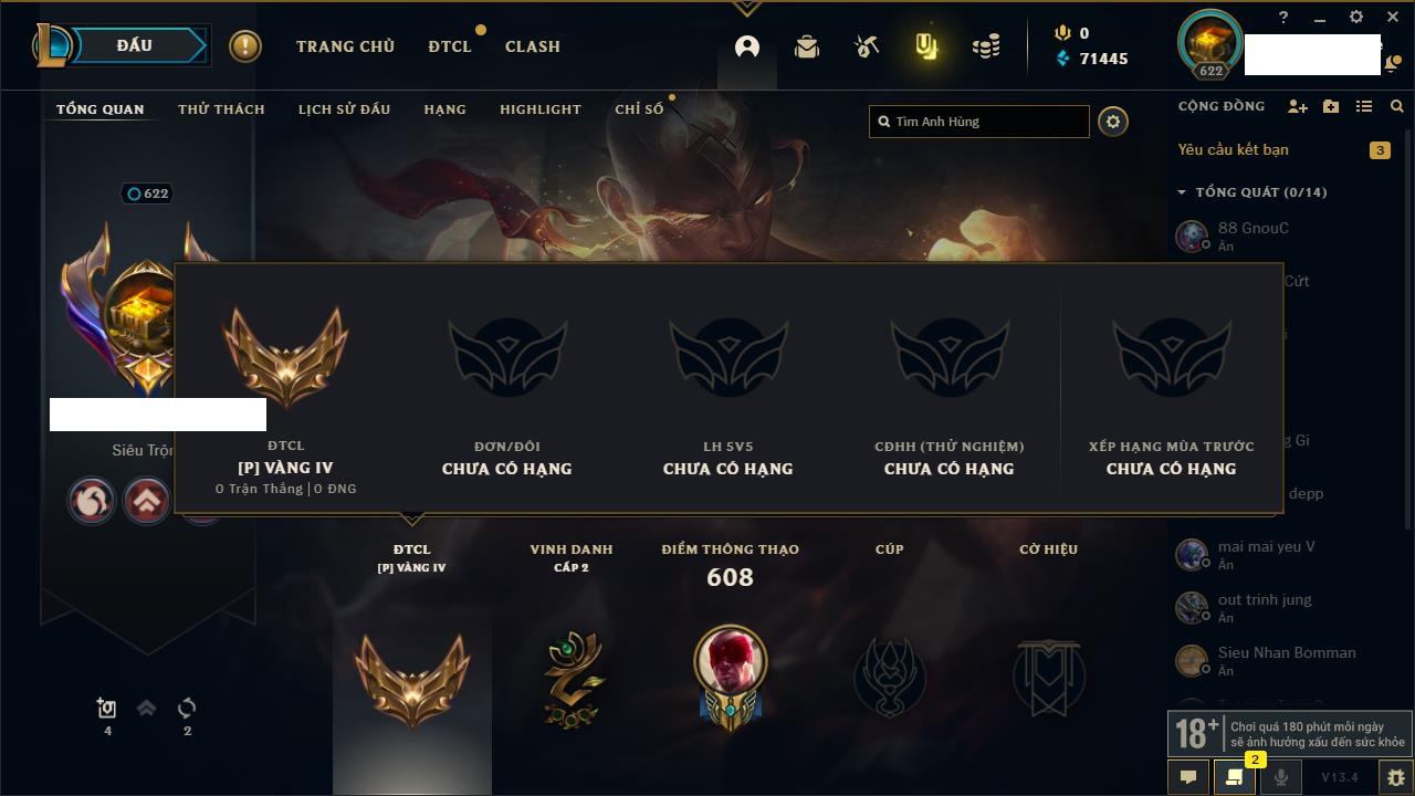 Rank Đơn: Bạch Kim IVKhung: Bạch kimTướng: 171 - Còn 182788 THXTrang Phục: 158Rank ĐTCL: Lục Bảo IVLinh Thú: 56