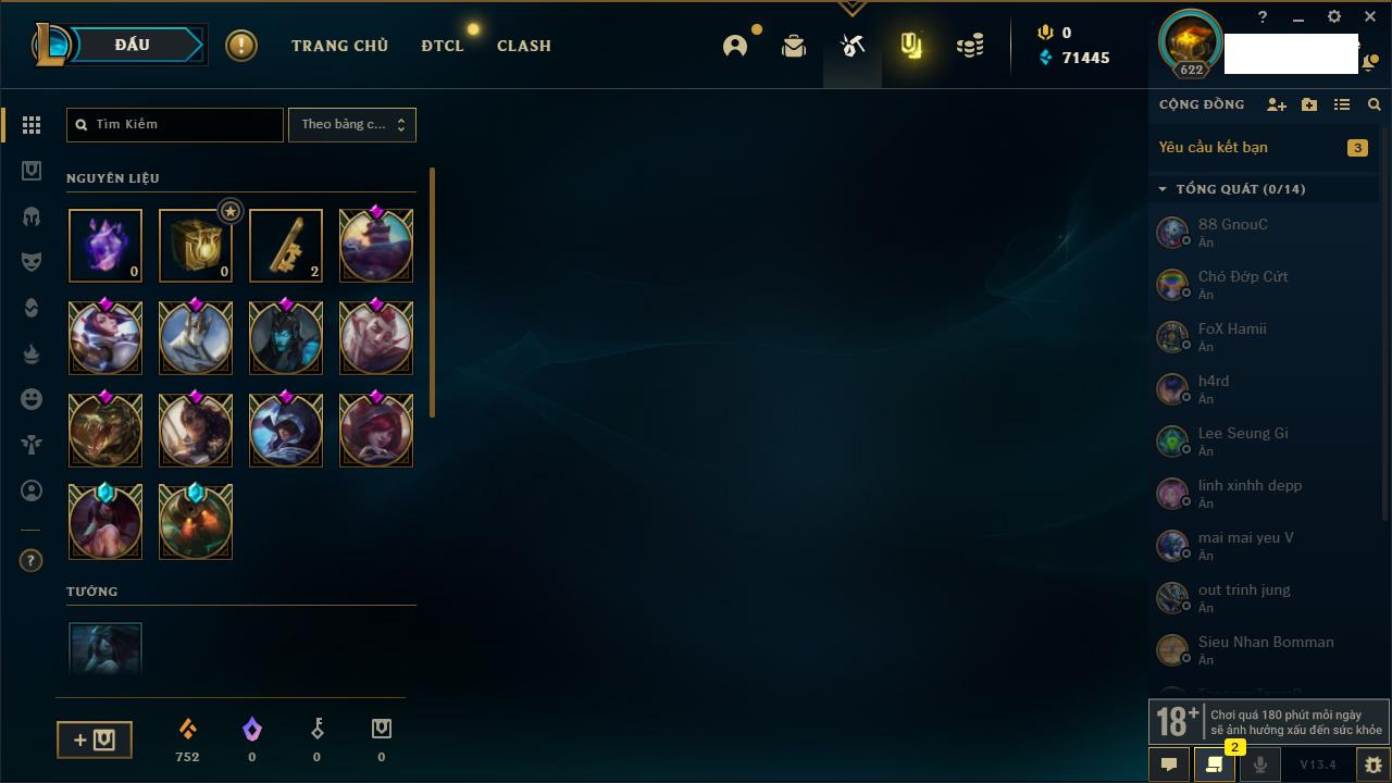 Rank Đơn: Bạch Kim IIKhung: Bạch kimTướng: 171 - Còn 263986 THXTrang Phục: 306Rank ĐTCL: Lục Bảo IVLinh Thú: 96