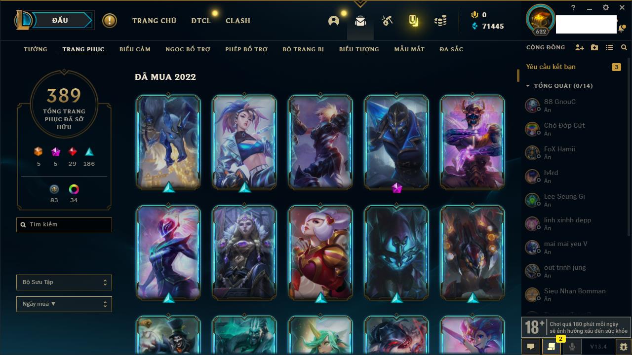 Rank Đơn: Đồng IIIKhung: ĐồngTướng: 170 - Còn 48082 THXTrang Phục: 272Rank ĐTCL: Chưa RankLinh Thú: 84