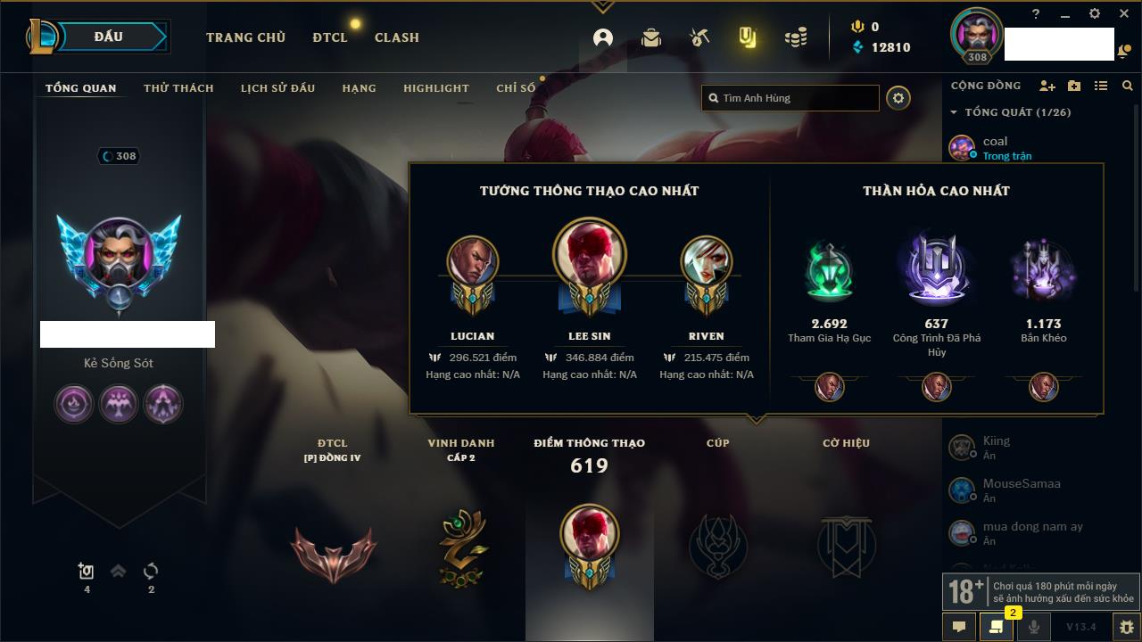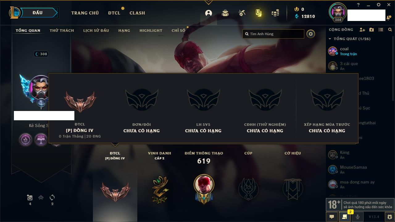 Rank Đơn: Chưa RankKhung: Chưa có khungTướng: 171 - Còn 827961 THXTrang Phục: 193Rank ĐTCL: Chưa RankLinh Thú: 63