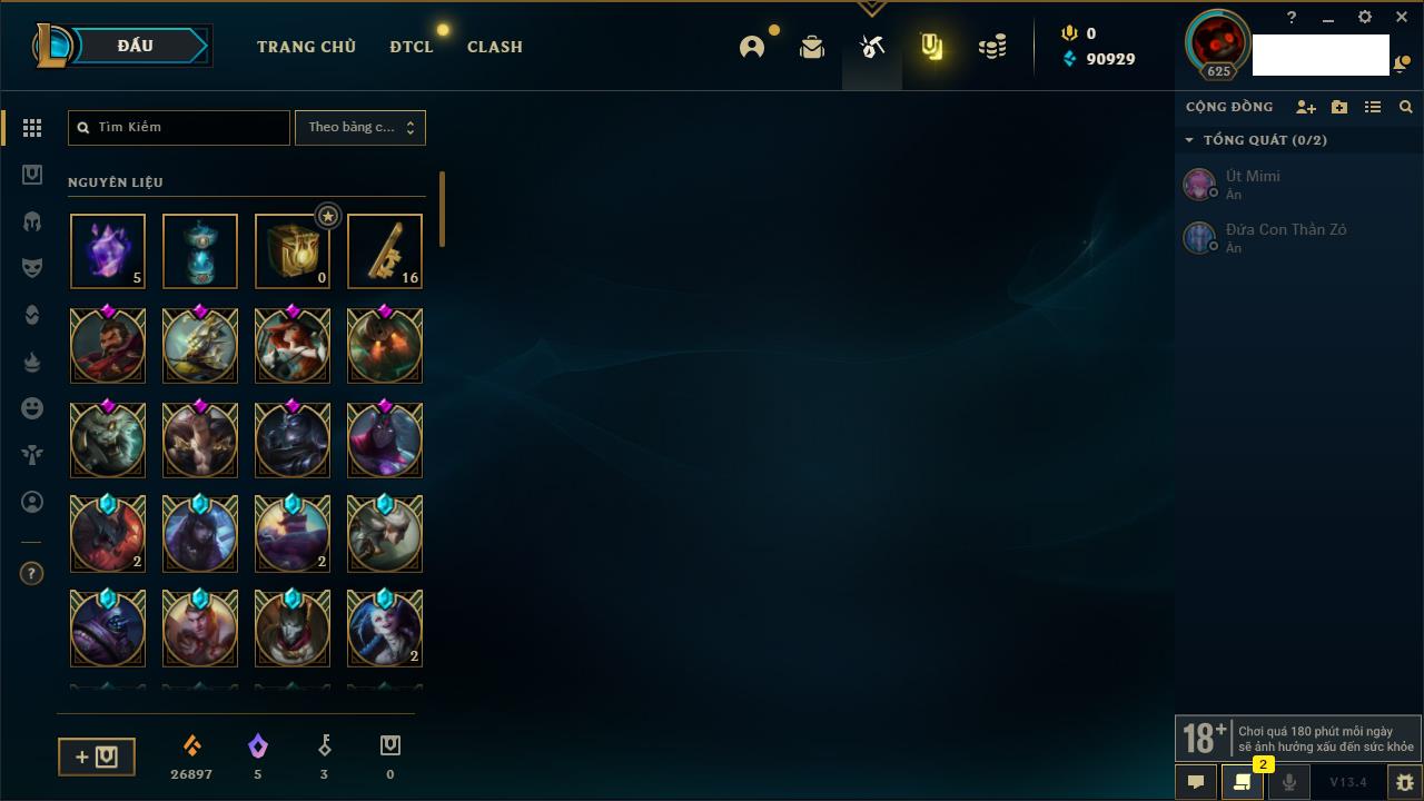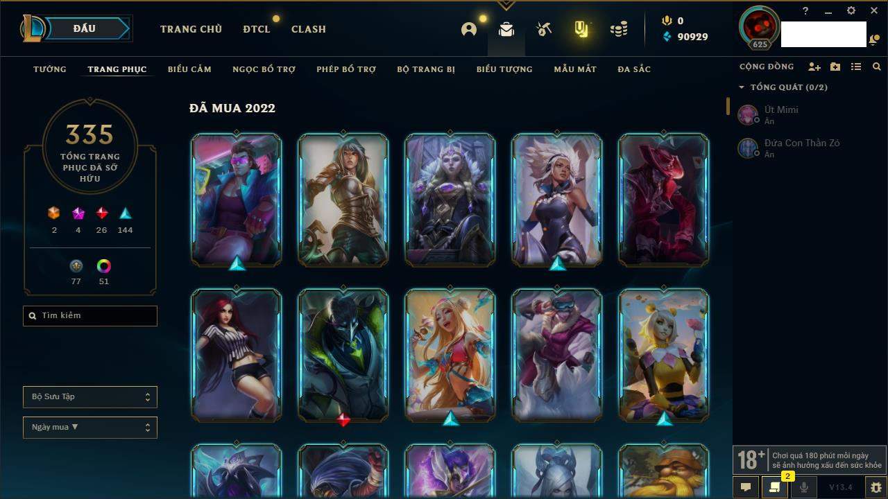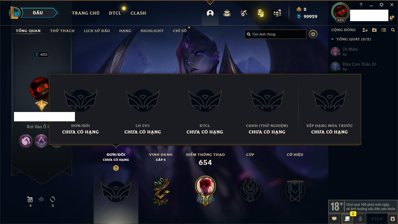 Rank Đơn: Vàng IKhung: Bạch kimTướng: 170 - Còn 212450 THXTrang Phục: 214Rank ĐTCL: Bạch Kim IVLinh Thú: 221