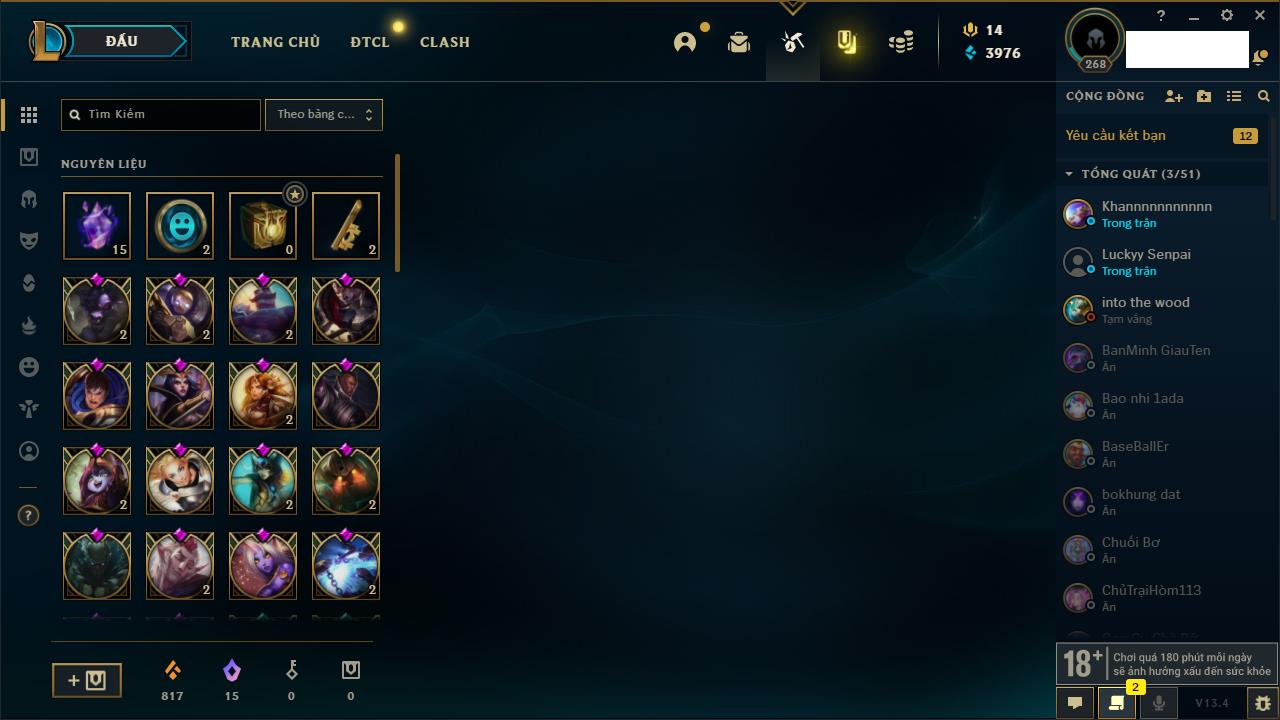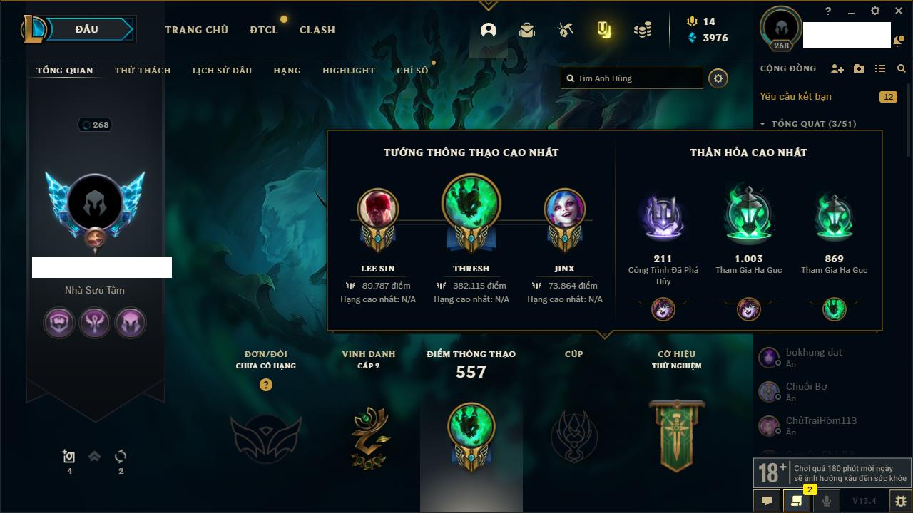 Rank Đơn: Chưa RankKhung: Chưa có khungTướng: 171 - Còn 827961 THXTrang Phục: 193Rank ĐTCL: Chưa RankLinh Thú: 63