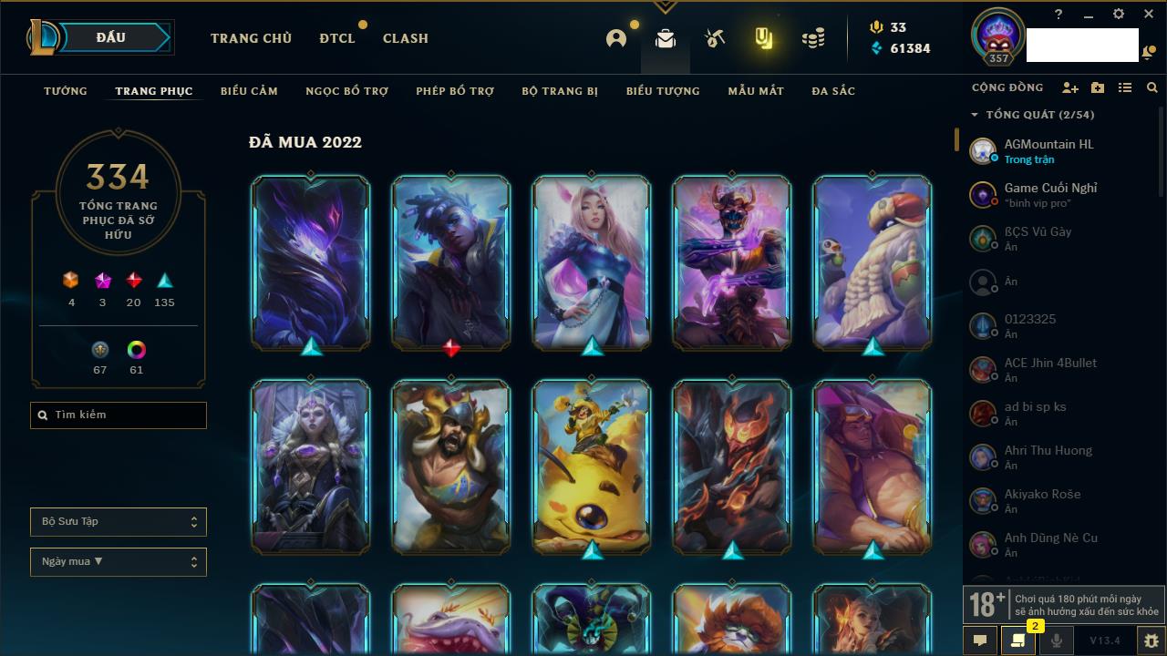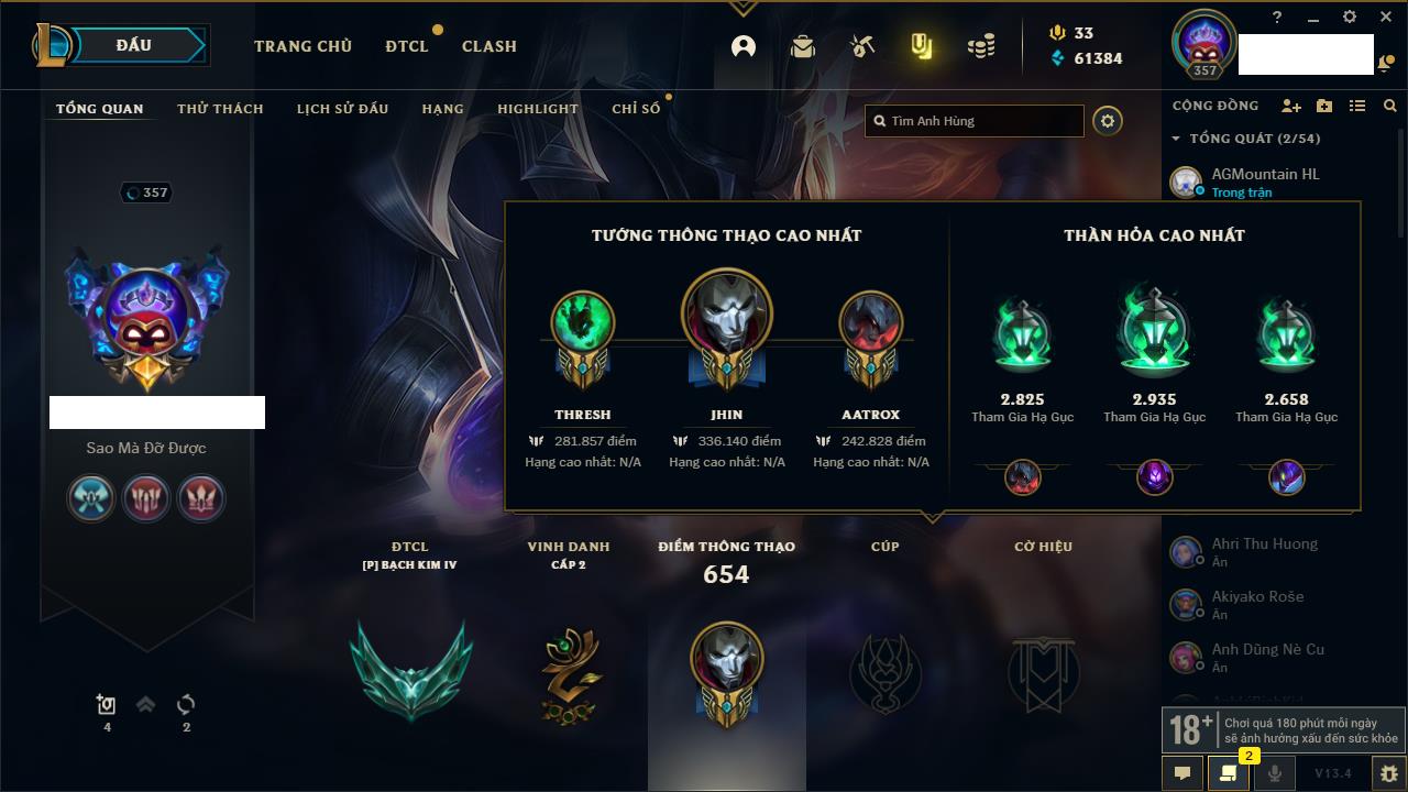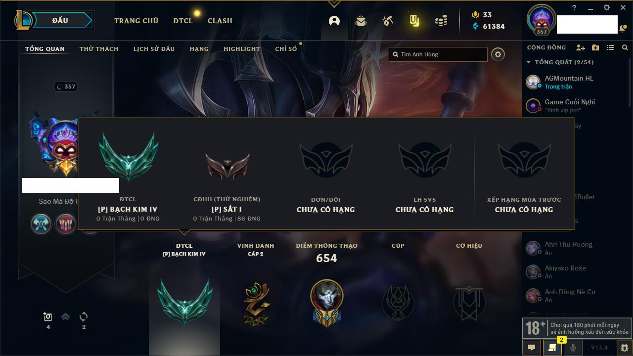 Rank Đơn: Vàng IKhung: Bạch kimTướng: 170 - Còn 212450 THXTrang Phục: 214Rank ĐTCL: Bạch Kim IVLinh Thú: 221