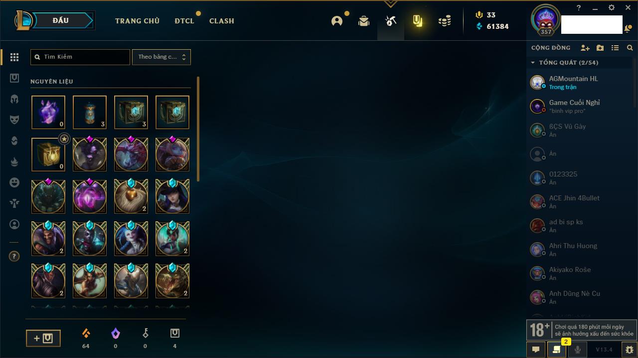Rank Đơn: Bạch Kim IIIKhung: Bạch kimTướng: 170 - Còn 61079 THXTrang Phục: 352Rank ĐTCL: Sắt IILinh Thú: 70