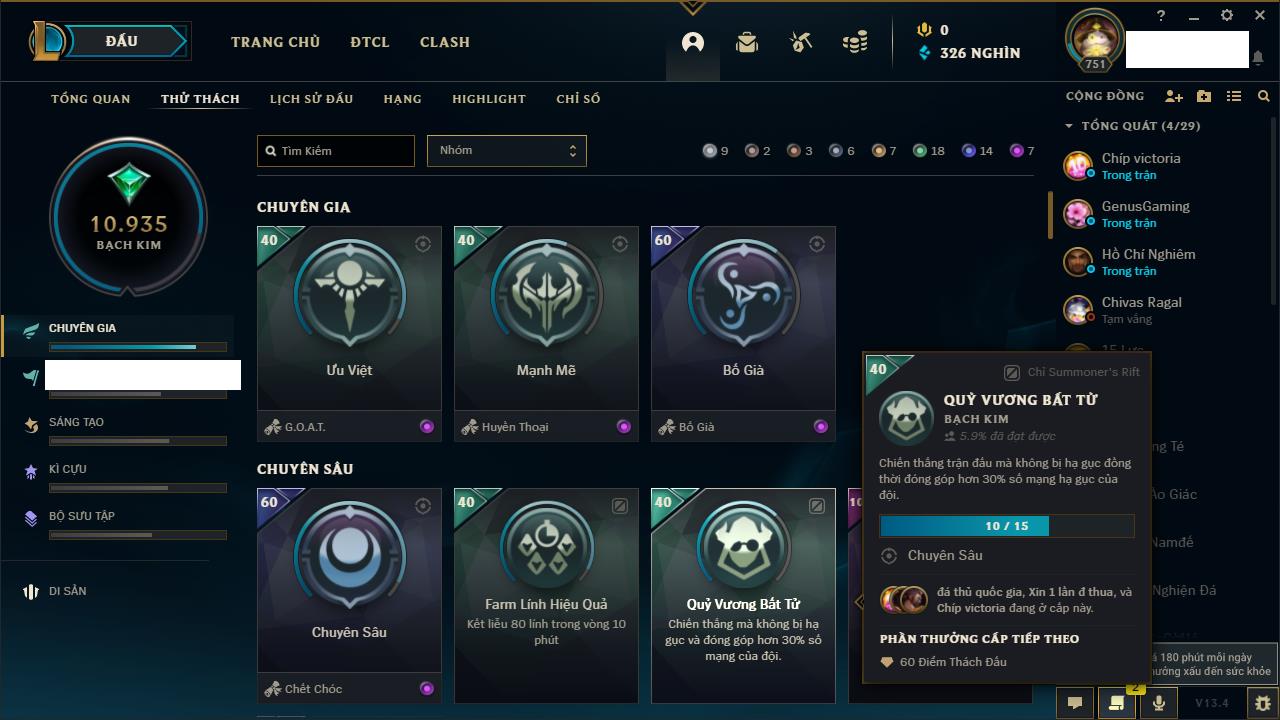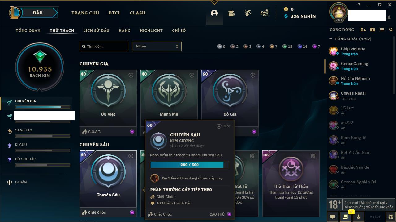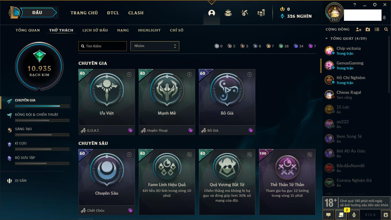 Rank Đơn: Bạch Kim IVKhung: Bạch kimTướng: 171 - Còn 182788 THXTrang Phục: 158Rank ĐTCL: Lục Bảo IVLinh Thú: 56
