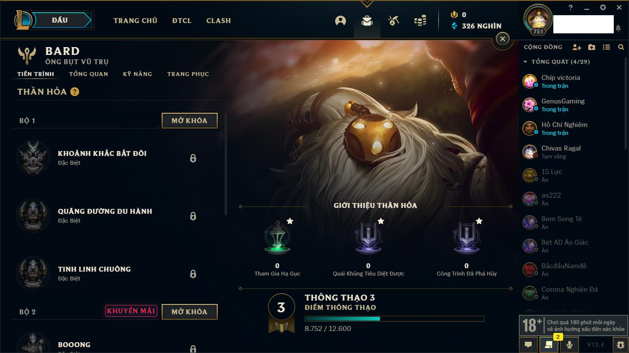 Rank Đơn: Vàng IVKhung: VàngTướng: 172 - Còn 2742 THXTrang Phục: 367Rank ĐTCL: Chưa RankLinh Thú: 214