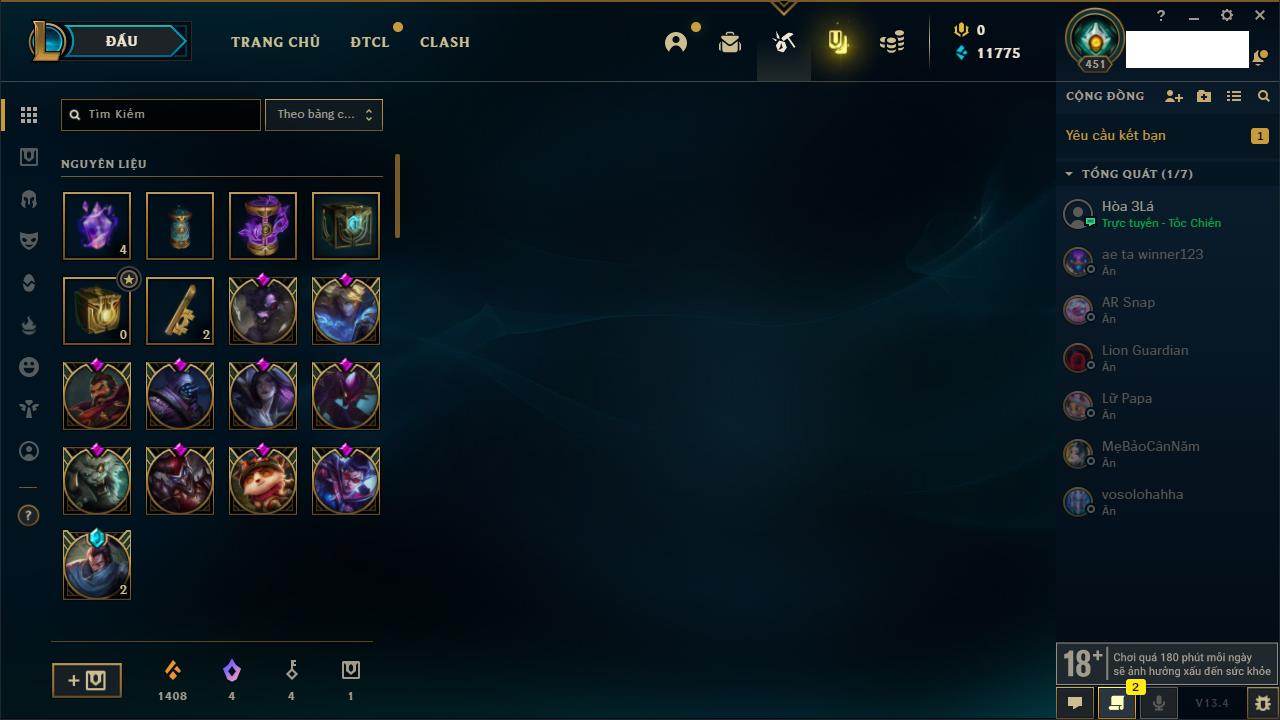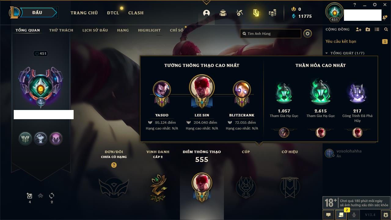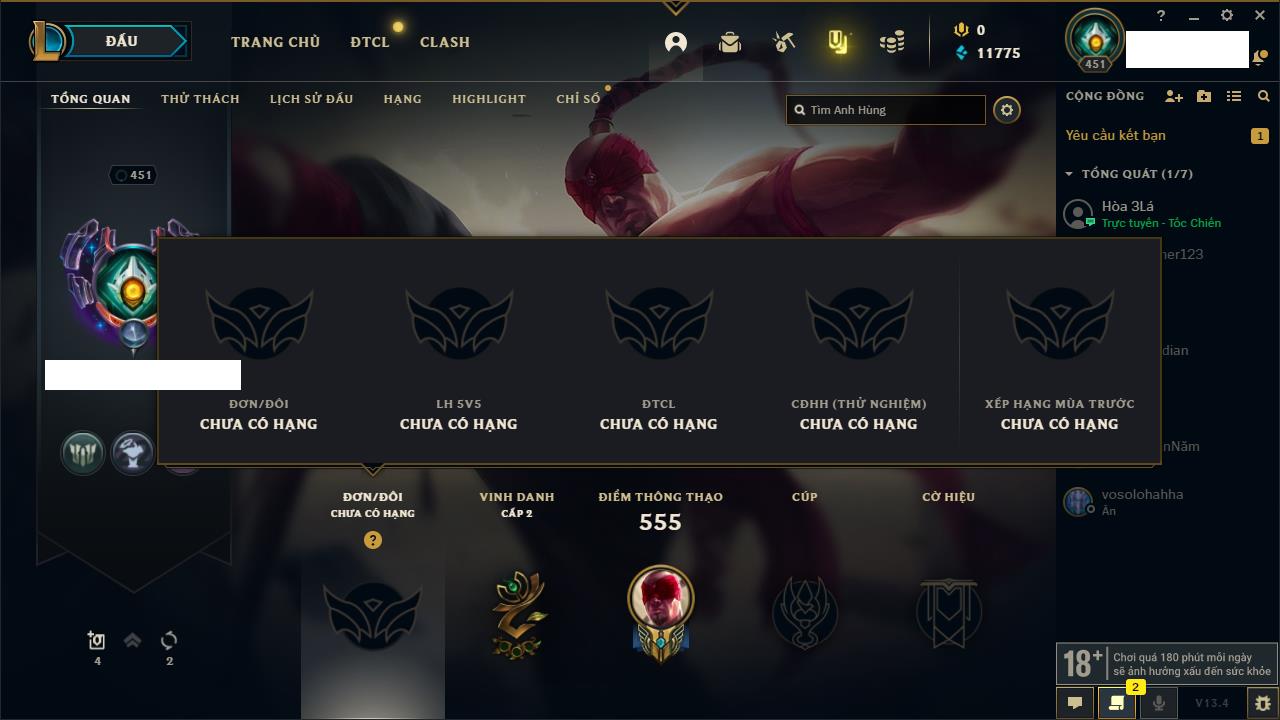 Rank Đơn: Bạc IIKhung: Chưa có khungTướng: 145 - Còn 12230 THXTrang Phục: 183Rank ĐTCL: Chưa RankLinh Thú: 71