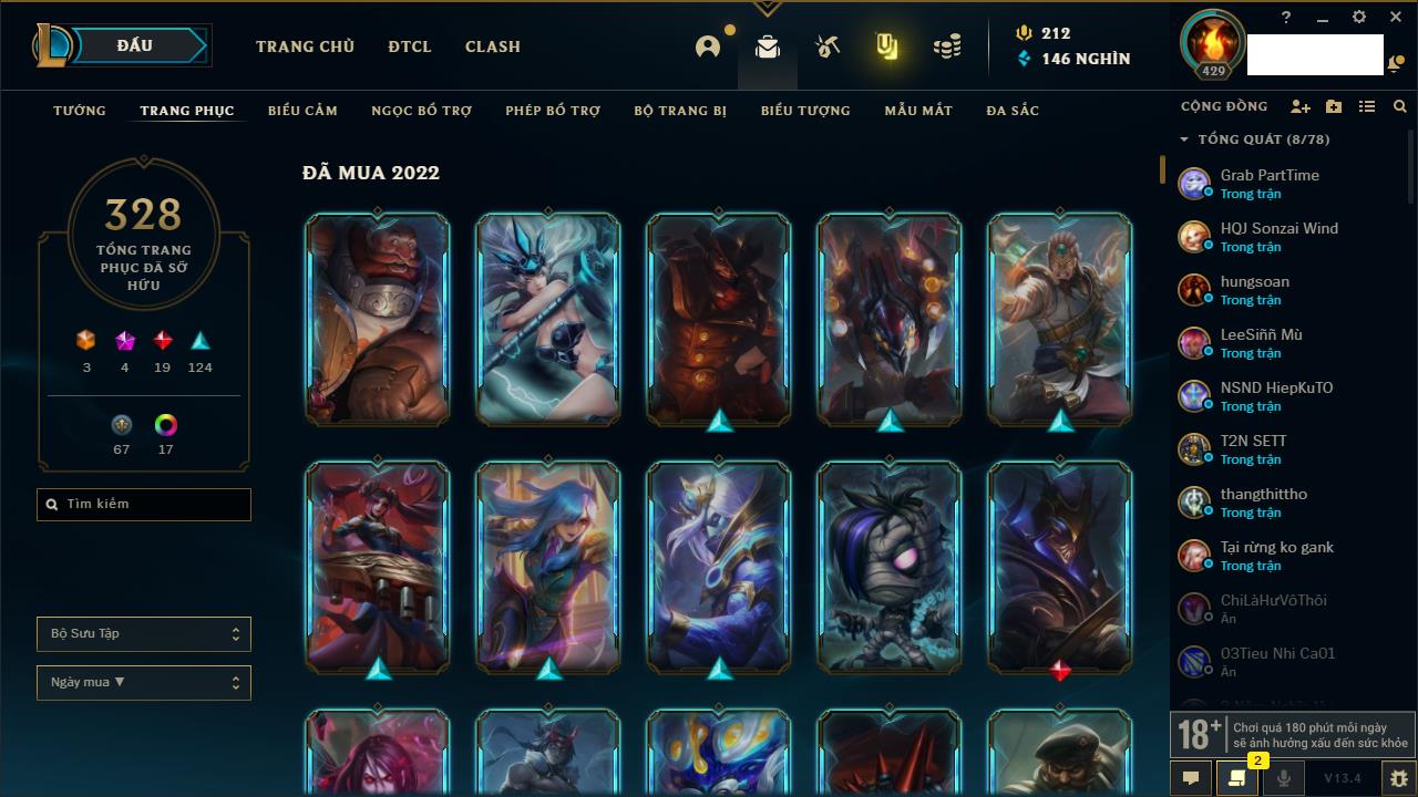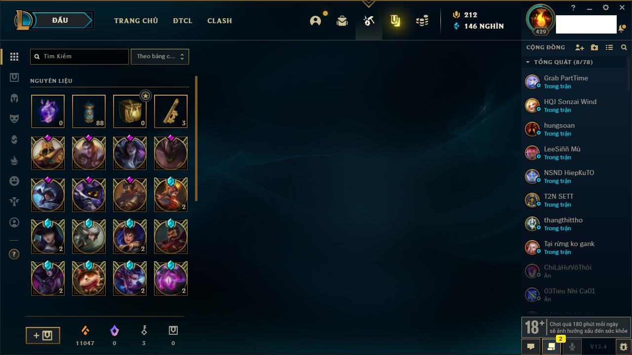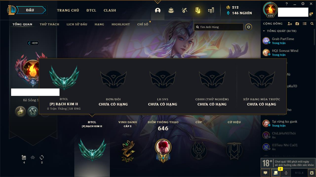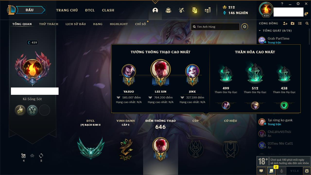 Rank Đơn: Chưa RankKhung: Bạch kimTướng: 171 - Còn 182788 THXTrang Phục: 158Rank ĐTCL: Chưa RankLinh Thú: 56