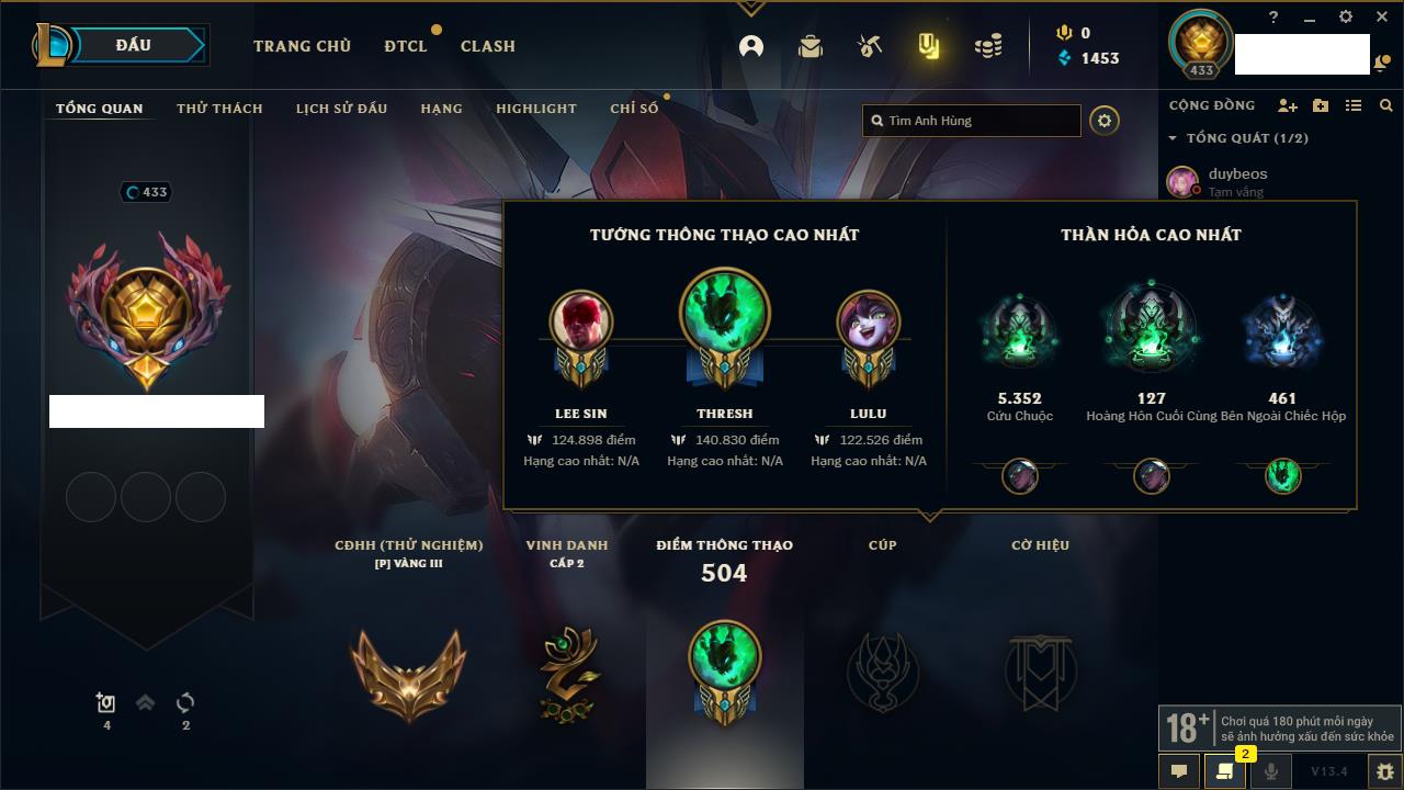 Rank Đơn: Chưa RankKhung: Chưa có khungTướng: 171 - Còn 827961 THXTrang Phục: 193Rank ĐTCL: Chưa RankLinh Thú: 63