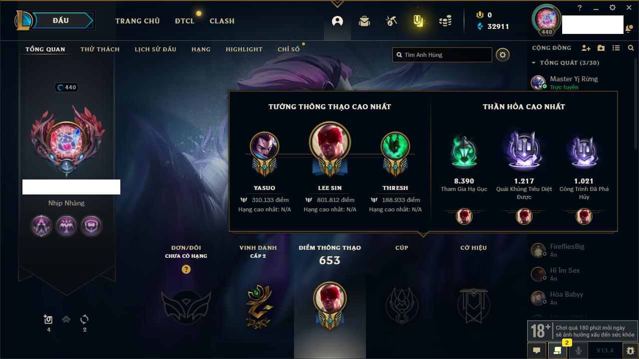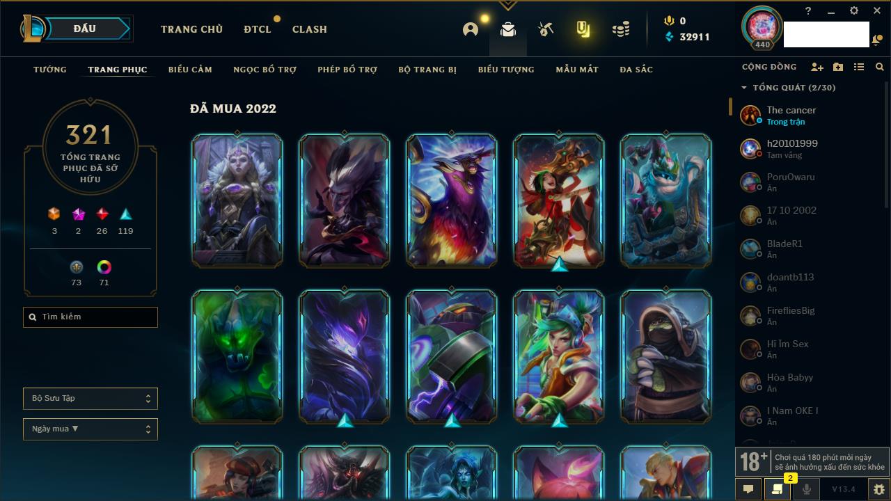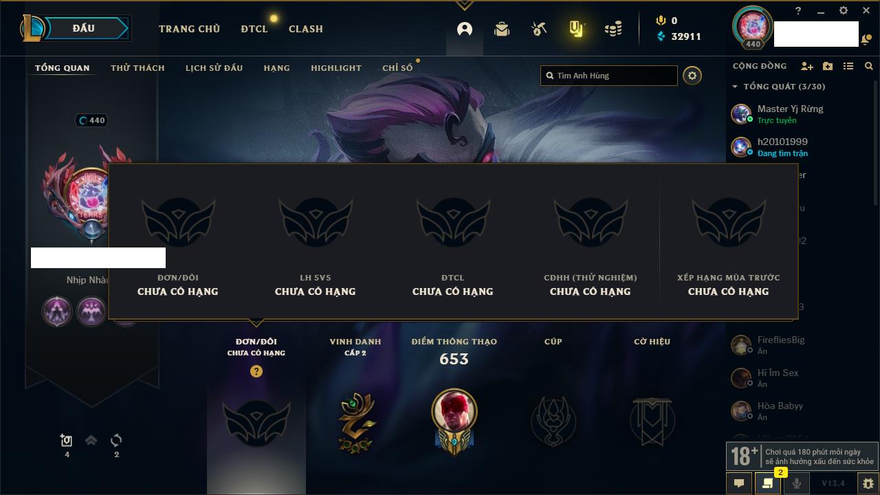 Rank Đơn: Chưa RankKhung: Bạch kimTướng: 171 - Còn 182788 THXTrang Phục: 158Rank ĐTCL: Chưa RankLinh Thú: 56