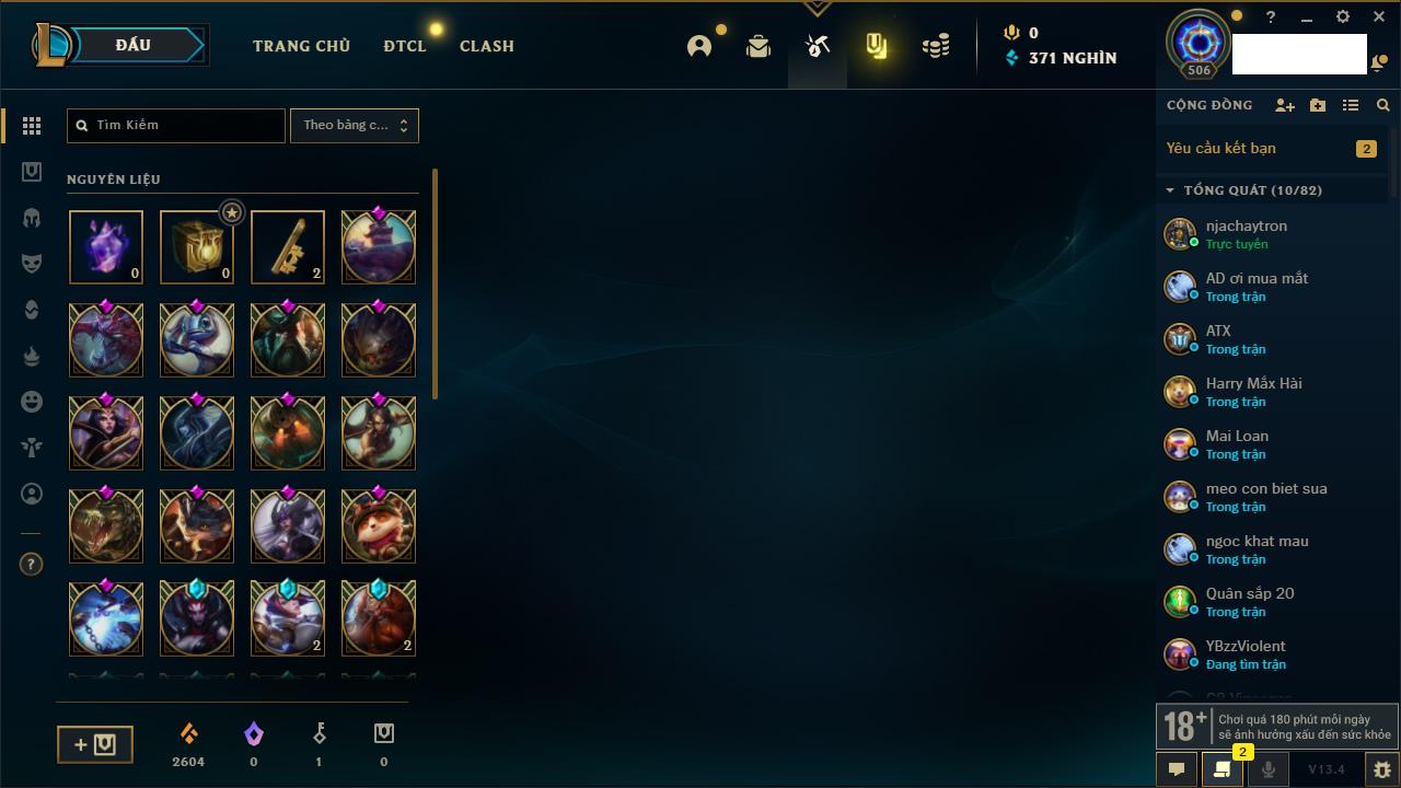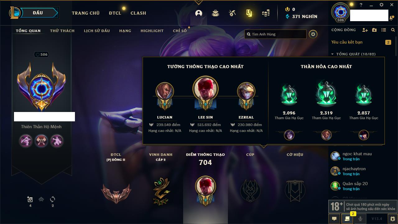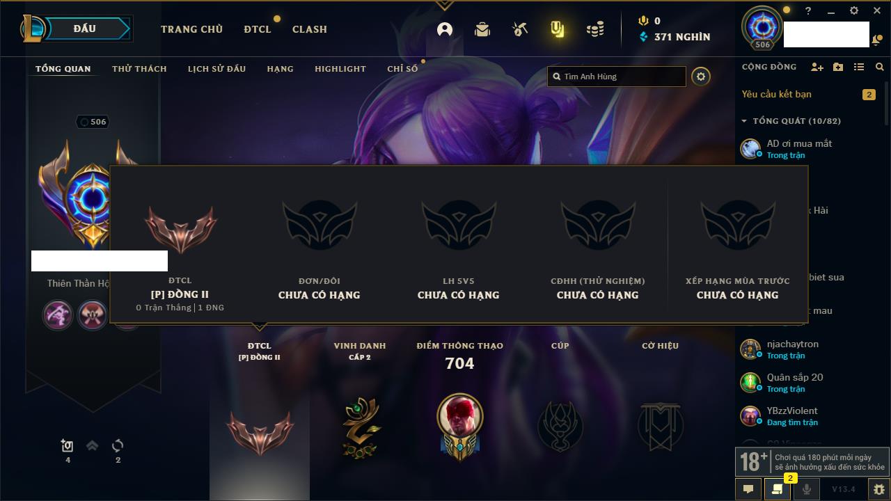 Rank Đơn: Bạch Kim IIKhung: Bạch kimTướng: 171 - Còn 263986 THXTrang Phục: 306Rank ĐTCL: Lục Bảo IVLinh Thú: 96