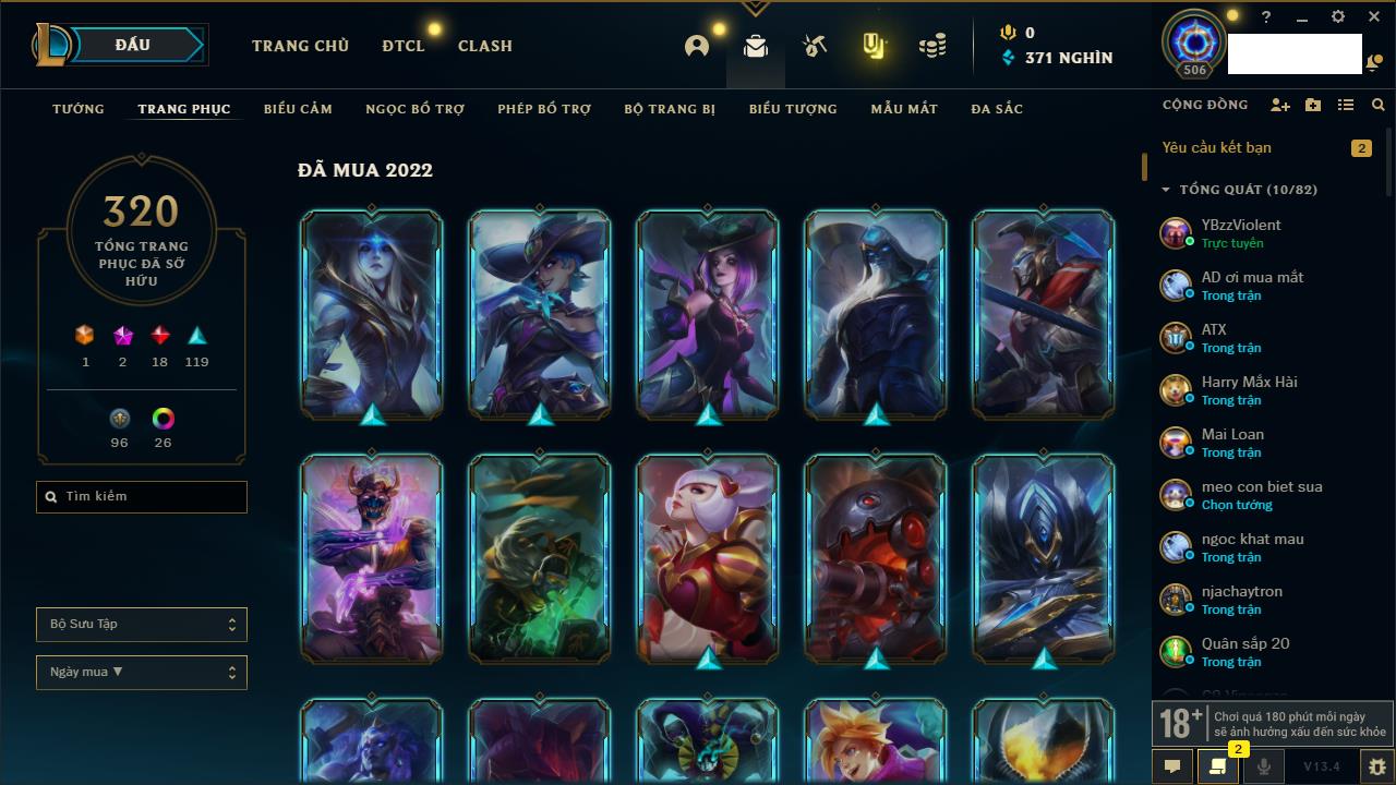 Rank Đơn: Vàng IIKhung: VàngTướng: 170 - Còn 330764 THXTrang Phục: 294Rank ĐTCL: Chưa RankLinh Thú: 58