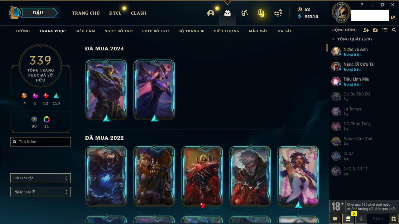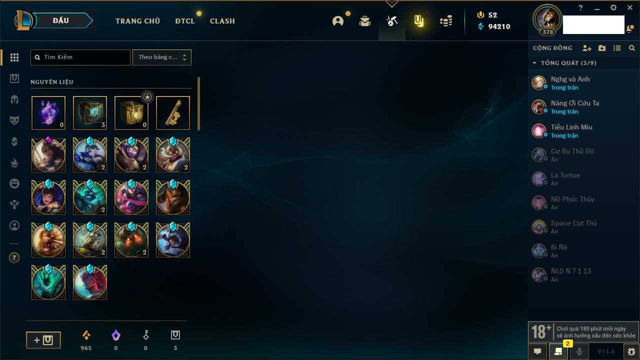 Rank Đơn: Vàng IIIKhung: VàngTướng: 171 - Còn 224994 THXTrang Phục: 273Rank ĐTCL: Vàng IVLinh Thú: 192