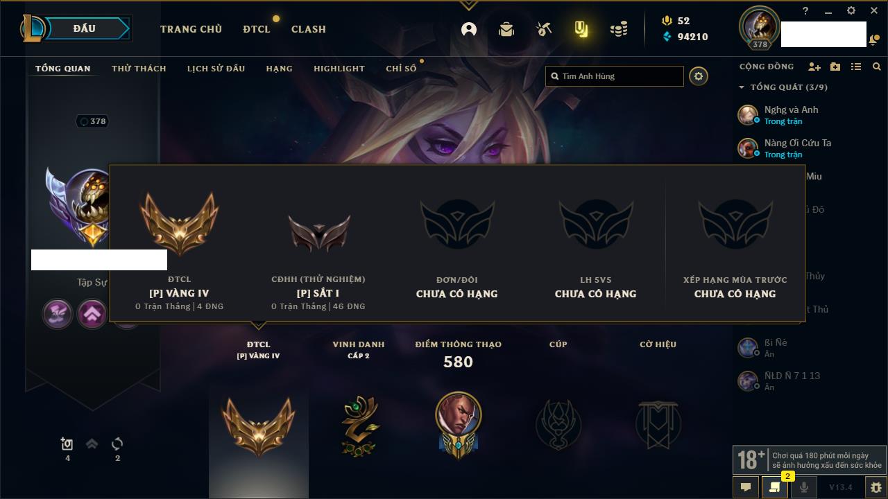 Rank Đơn: Vàng IKhung: BạcTướng: 171 - Còn 60584 THXTrang Phục: 286Rank ĐTCL: Vàng IIILinh Thú: 117
