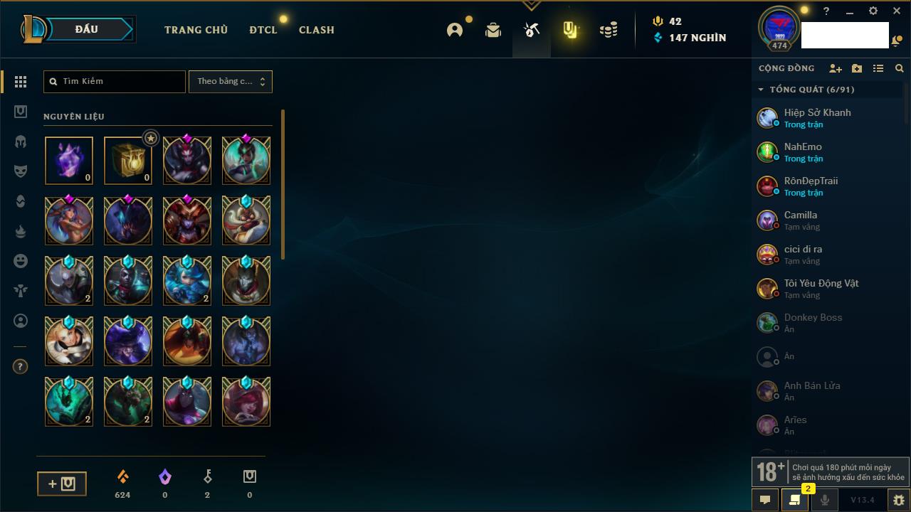 Rank Đơn: Vàng IKhung: BạcTướng: 171 - Còn 60584 THXTrang Phục: 286Rank ĐTCL: Vàng IIILinh Thú: 117