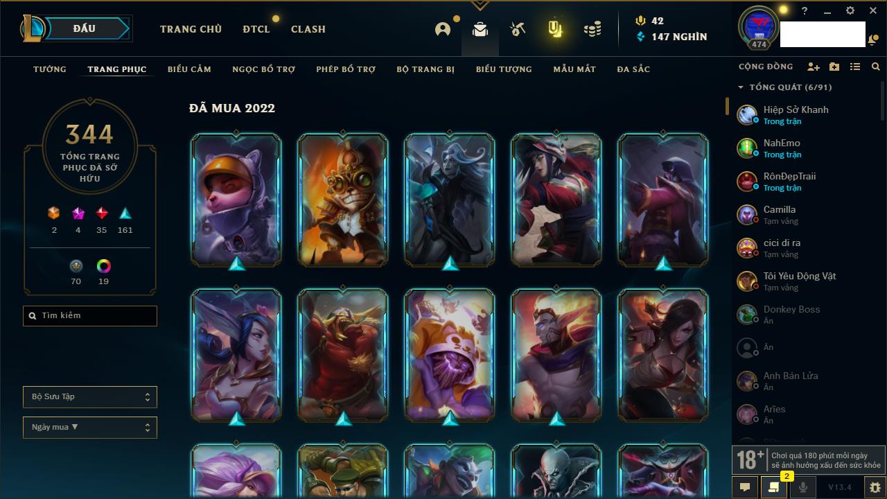 Rank Đơn: Vàng IIIKhung: VàngTướng: 171 - Còn 88128 THXTrang Phục: 329Rank ĐTCL: Chưa RankLinh Thú: 41