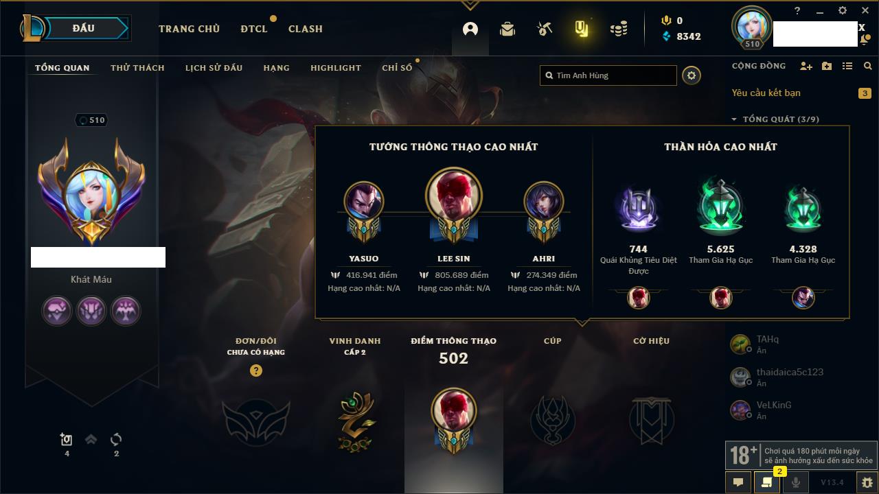 Rank Đơn: Chưa RankKhung: Bạch kimTướng: 172 - Còn 10879 THXTrang Phục: 288Rank ĐTCL: Chưa RankLinh Thú: 69