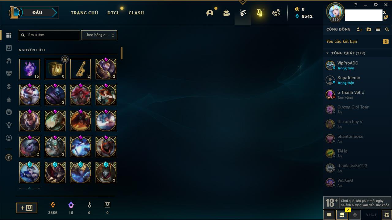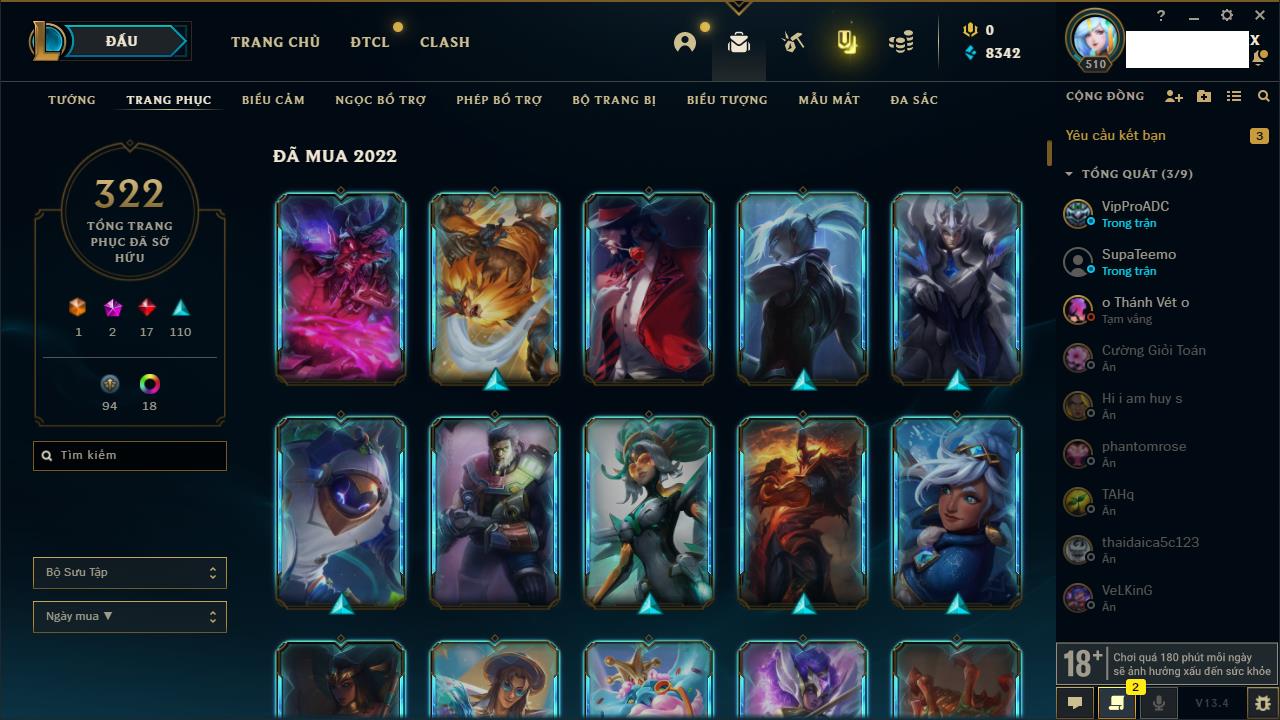 Rank Đơn: Chưa RankKhung: Bạch kimTướng: 171 - Còn 182788 THXTrang Phục: 158Rank ĐTCL: Chưa RankLinh Thú: 56